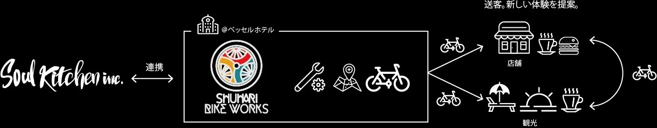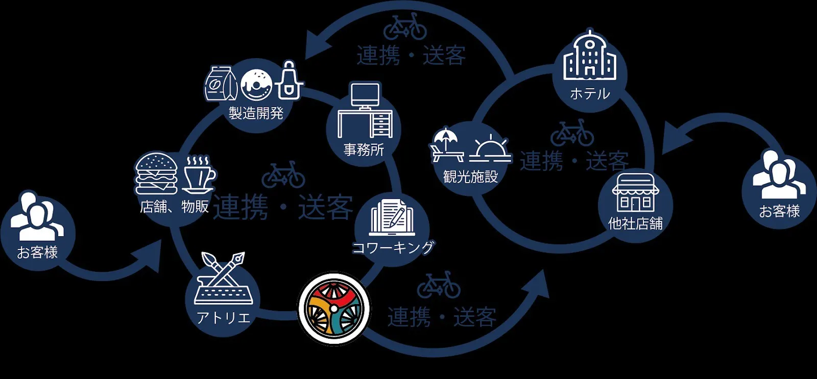 全てを一つの体験として提案できる場所として各要素と連携することで集客が循環し結果『働、食、住』全てにおいて価値の高い地域になり お客様の満足度が高い エリアになります。