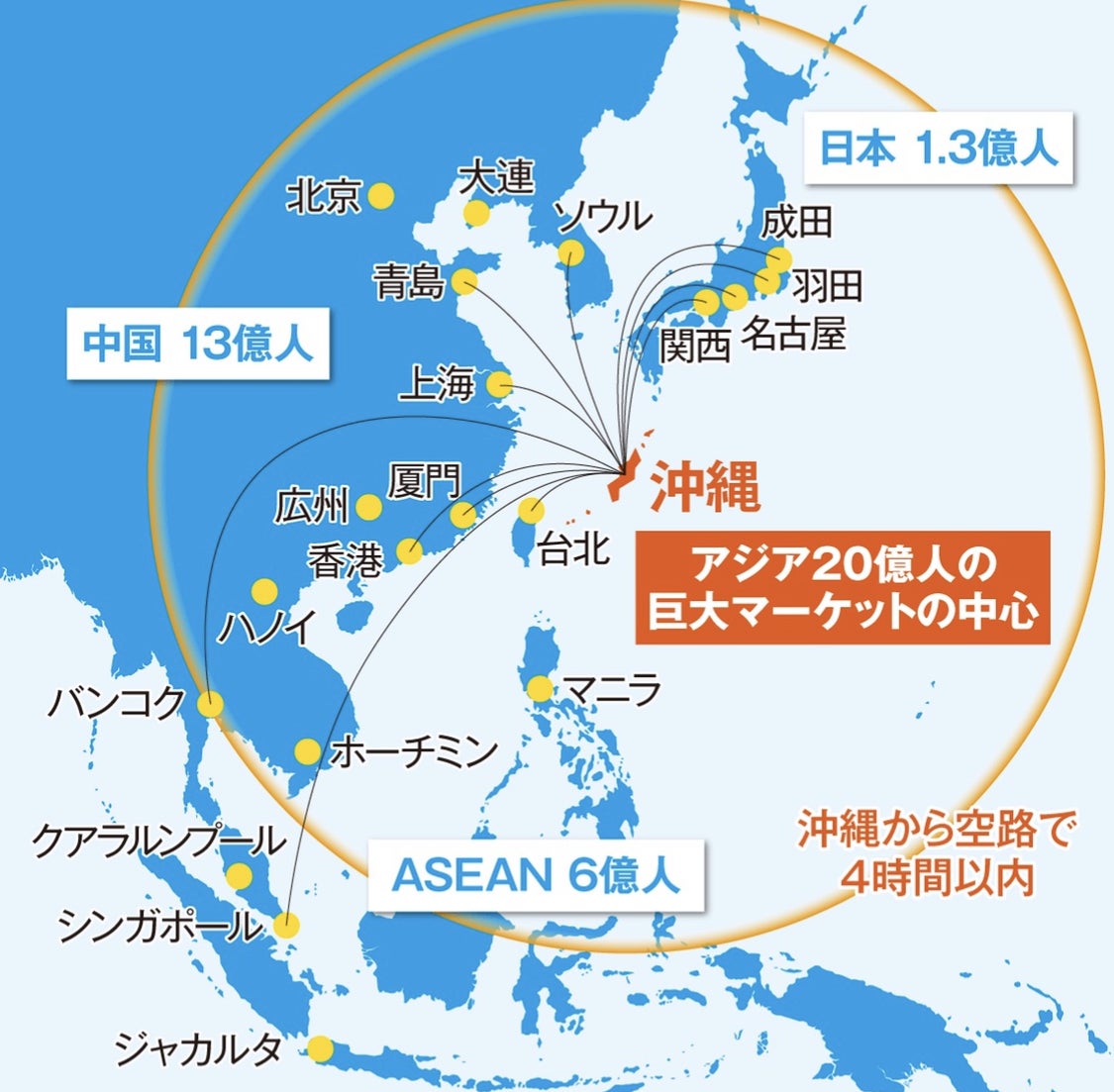 沖縄から空路で4時間の円に20億人の活発なマーケットがありその中心に沖縄が位置しています