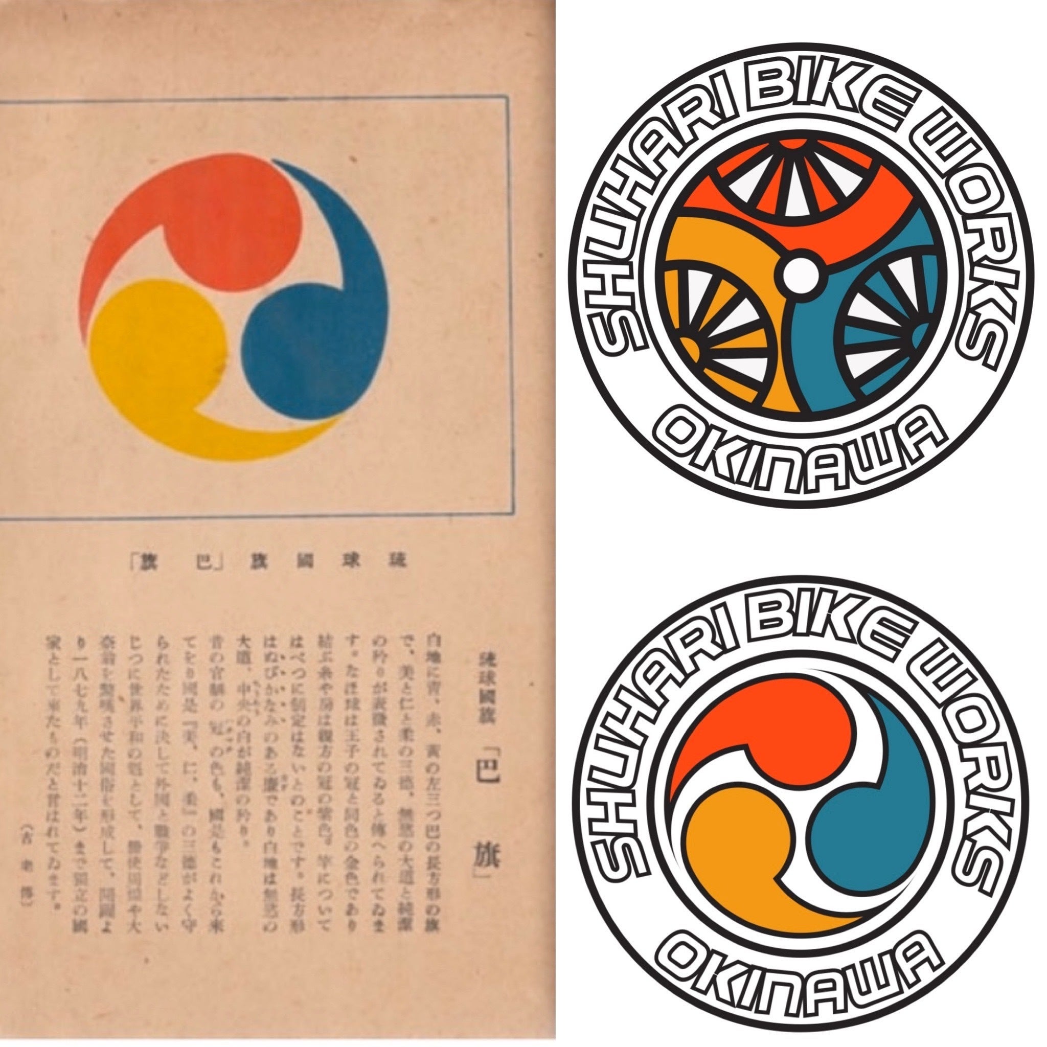 守破離とは、日本の伝統芸能などの師弟関係で使われる段階のことで「守」は師や流派の教え、型、技を忠実に守り、確実に身につける段階。「破」は、他の師や流派の教えについても考え、良いものを取り入れ、心技を発展させる段階。「離」は、一つの流派から離れ、独自の新しいものを生み出し確立させる段階を表します。僕はそこから転じて、自転車という枠を越えて新しい概念の自転車の形を表現したいと思いこの名前を付けました。 奇しくも守破離は3つの言葉からなるもので 巴旗も3つの勾玉(美・仁・柔の三徳)からなり沖縄発の自転車屋としては ルーツになるところが欲しかったのでぴったりのロゴが出来上がったと感じています。