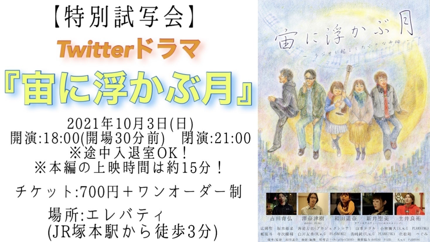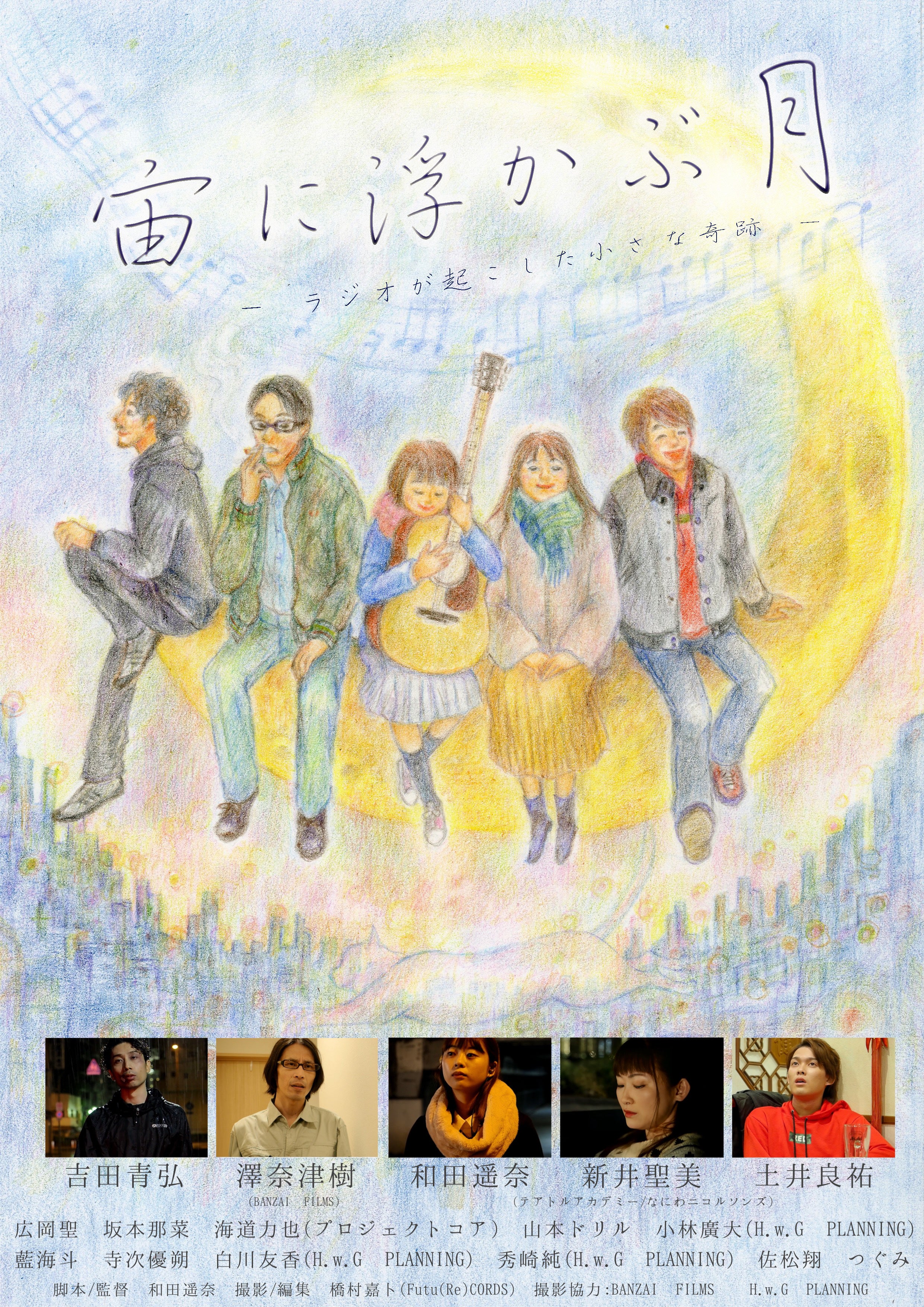 全体を通して伝えたいことは、「何にもない日常は何でもない訳ではない」ということです。クラウドファンディングを経て、コロナに振り回されて、人との繋がりに関して凄く考えさせられました。夢を追いかけてバイトばかりの日々は、退屈で仕方ありませんが、その間に出会った人達が、クラウドファンディングを支援してくださったり、クラウドファンディングの宣伝活動に協力してくださったり、そのお陰で私のことを全く知らない方が支援してくださったり、私に内緒で関係者の方がこっそりと支援してくださったり。コロナで見えない未来に打ちひしがれそうな心が、クラウドファンディングを通して人との繋がりを感じた事によって、私はかなり救われました。それで、スピンオフの脚本を書きました!でも、これは日常生活でも言えることで、ユイ、ジョウタ、ナオコ、ユタカ、マモルのそれぞれは、人生の転機に偶然にもラジオを聞いていて、それによって変わった人生が誰かに何かを伝えた結果、気づいたら誰かの人生を変えるきっかけになっていて、、、。絶対無いとは言い切れない偶然を物語にすることによって、「今が結果ではなく、今によって変わった未来が結果」だということを改めて伝えたいと思いました。今を投げ出しそうな人に、投げ出して欲しくないって、伝えたいって、思いました。第2話とスピンオフは、今の自分達の状況をリアルに表現しようと思ってます。2020年9月に映画の撮影をしているシーン。熱中症対策だけではなく、コロナ対策もしないといけない今の撮影現場。暑いのに、マスクやフェイスガードを付けないといけません。でも、目には見えない敵に少し怯えながらも、今何かを伝えたくて一生懸命映画を撮っている人達がいます。過去の経験と今を通して、撮りたい映画があるジョウタが伝えたい事、それに共感して映画作りに協力してくれる仲間、その姿自体がメッセージとして受け取っていただけると幸いです!ユイ 和田遥奈(ハネオロシ)ジョウタ 吉田青弘ナオコ 新井聖美 (テアトルアカデミー/なにわニコルソンズ)ユタカ 土井良祐(ハネオロシ)マモル 澤奈津樹(BANZAI FILMS) 助監督 坂本那菜大御所俳優 海道力也(プロジェクトコア)劇中映画主人公役 寺次優朔劇中映画ヒロイン 白川友香(H.w.G PLANNING)芸能マネージャー 秀崎純(H.w.G PLANNING)林檎屋さん 山本ドリルサトル 広岡聖コウタ 小林廣大(H.w.G PLANNING)高校生時代のマモル 佐松翔幼少期のユイ つぐみ時任凛太郎 藍海斗ラジオ局先輩オペレーター ウサギ(H.w.G PLANNING)ラジオ局後輩オペレーター 北村飛翔中華料理屋店長 赤田健(BANZAI FILMS)中華料理屋店員 上木椛(BANZAI FILMS)劇中映画『この世の果て』エキストラうみのはるかつぐみみ〜さん江星名海中野渚邨田優撮影/本編編集 橋村嘉ト(Futu(Re)CORDS)メイキング 北村飛翔照明 澤奈津樹(BANZAI FILMS)照明補佐 赤田健(BANZAI FILMS)音響 鬼村悠希(BANZAI FILMS) 小林廣大(H.w.G PLANNING)補佐 石丸英生(H.w.G PLANNING) ウサギ(H.w.G PLANNING) 佐松翔 上木椛 山本ドリルヘアメイク 山之内花澄(한수정) グエンニャットニュ 岩井ゆうか宣伝美術 市橋淳子機材協力 H.w.G PLANNING BANZAI FILMS主題歌『宙に浮かぶ月』歌手:小野瑞生 作曲:橋村嘉ト 作詞:和田遥奈監督 和田遥奈