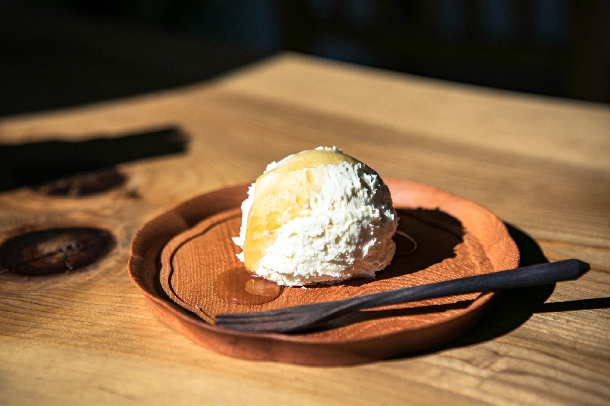 このレアチーズは、ヒガムコの名前で愛される東京墨田区の東向島珈琲店とのコラボ企画として始まり、ヒガムコの看板メニュー「レアチーズ」に能登の里山里海で採れたものをソースとしてかけています。