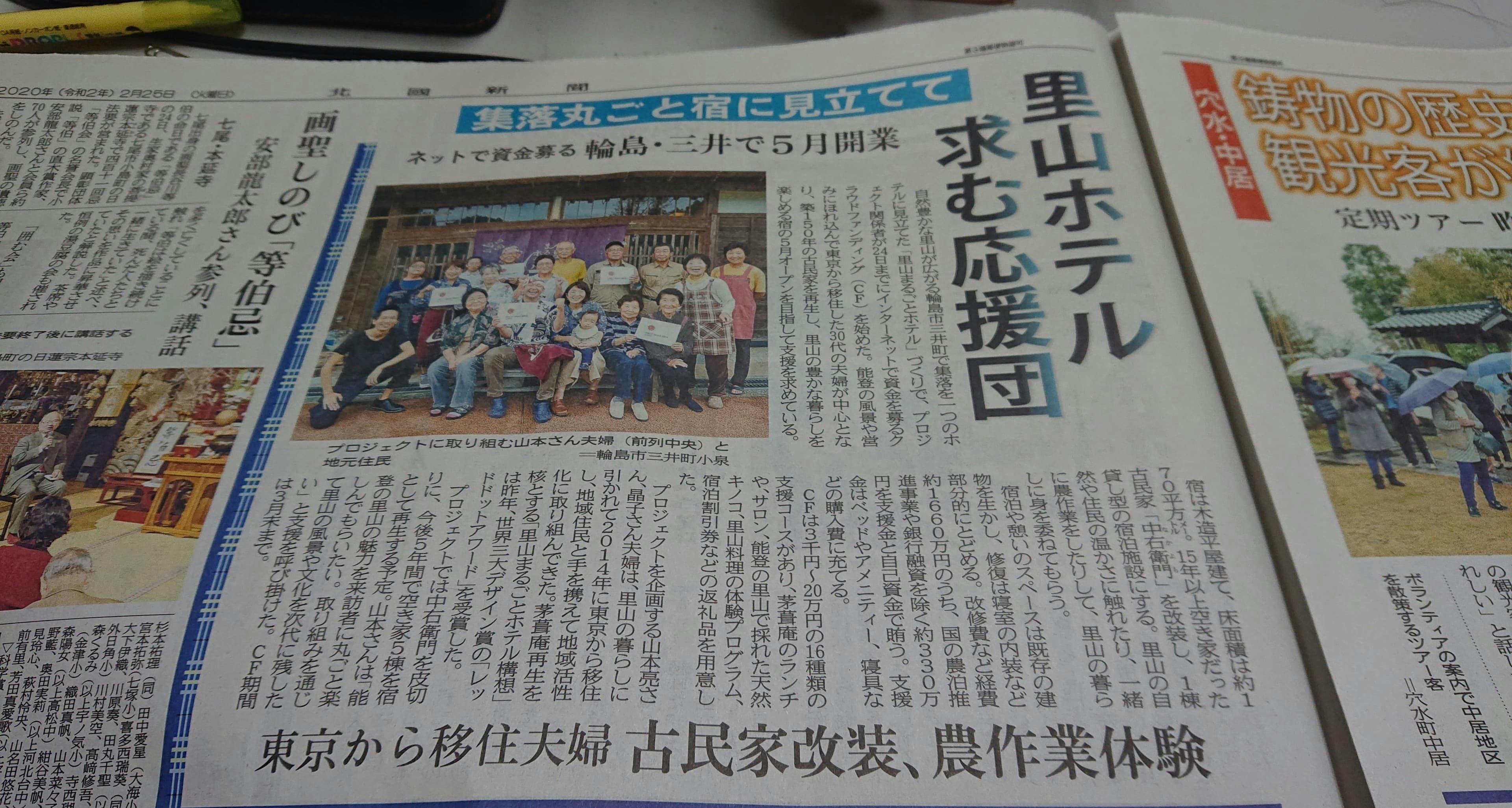 本日発売の北國新聞の朝刊に中右衛門のクラウドファンディングを紹介いただきました。