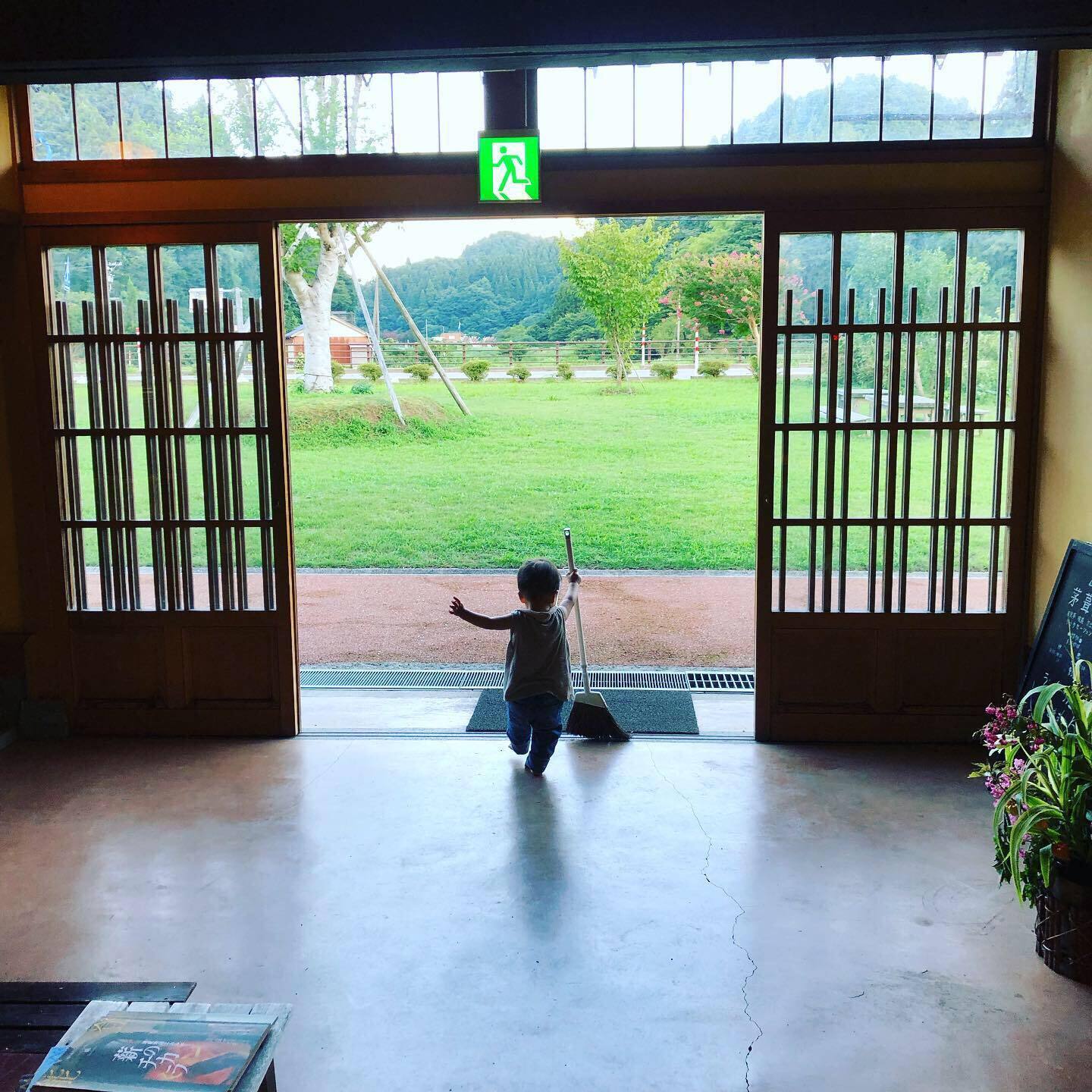 というのは冗談ですが、いつもお店を掃除している私たちやスタッフのことをみているからか、子ども店長の泰生(たいき)はホウキや塵取りをもってきてキャッキャしてます。
