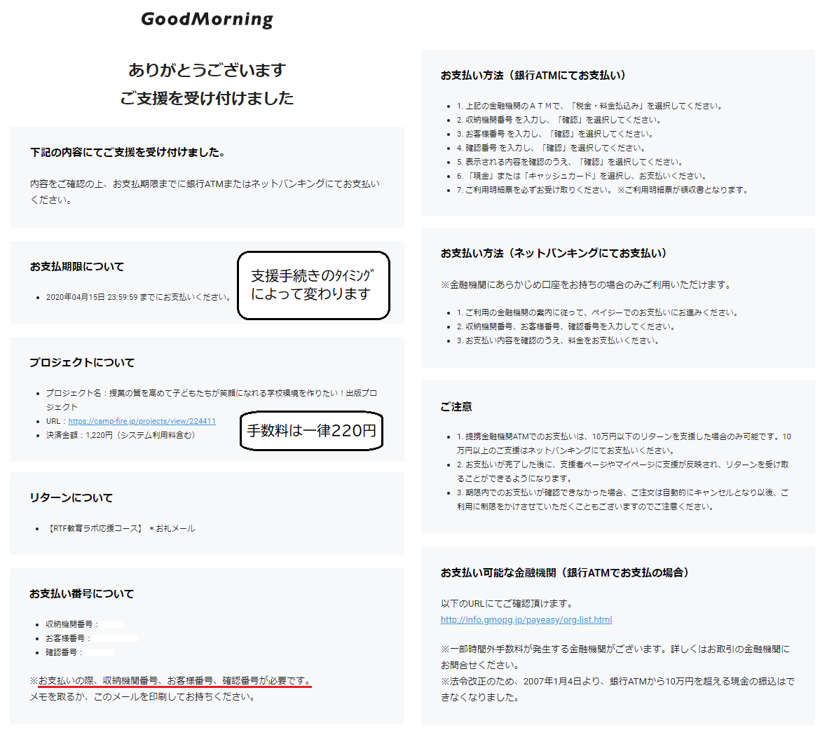 「お支払方法で銀行振込を選んだけれど、支払い方がわからない」という方はお読みください※「銀行振込にしたいけど支援の仕方がわからない!」という方は下記URLもご覧ください。 「Pay-easy払いでの支援に関して」のヘルプページ1、ご支援受け付けまでの流れ【入力】画面で「支援金額」「メールアドレス(ログインしない場合)」「お支払いの方法」「必要情報入力」「備考欄(記入が必要なリターンの場合)」等を入力し、【確認】画面で記入した内容を確認。「対応金融機関」もご確認ください。【完了】画面で「完了」をクリックすると、支払い時に必要な【収納機関番号】【お客様番号】【確認番号】【支払期限】が表示されます。念のためメモを取ってください。※同時に登録したメールアドレスに上記画像のような【CAMPFIRE】《必ずご確認ください》銀行振込のご案内という題名のメールが届きますが、登録アドレスが間違っていた、あるいは何らかの障害によって届かない場合もありますので、メモを取ることをお勧めします。2、お支払いの流れ<銀行ATMでお支払いの場合>完了ページもしくは上記画像に記載されている内容を参考にお支払いください。<ネットバンキングでお支払いの場合>完了ページ内の「金融機関選択画面に移動」からPay-easy(ペイジー)でのお支払いページに移動しネットバンク/モバイルバンクを選択★ネットバンキング(Pay-easy(ペイジー)か(ゆうちょダイレクト)を選ぶ場合→次のページで利用する金融機関を選ぶ→「ログイン」から金融機関のページにログイン→案内に従って【収納機関番号】【お客様番号】【確認番号】等を入力して支払い※払込先は「収納代行会社GMO-PG」です。「PEジーエムオーピージー」等と表示されます。※「完了画面を閉じてしまった場合」は利用する銀行のホームページからログインし、メニューから「税金・各種料金の払込」→「Pay-easy(ペイジー)で支払う」を選択することで支払い手続きができます。★モバイルバンキング(ゆうちょ銀行)を選ぶ場合→ページ内に表示されているバーコードを携帯電話で読み込む→表示された「携帯版お支払いサイト」の案内に従って【収納機関番号】【お客様番号】【確認番号】等を入力して支払い