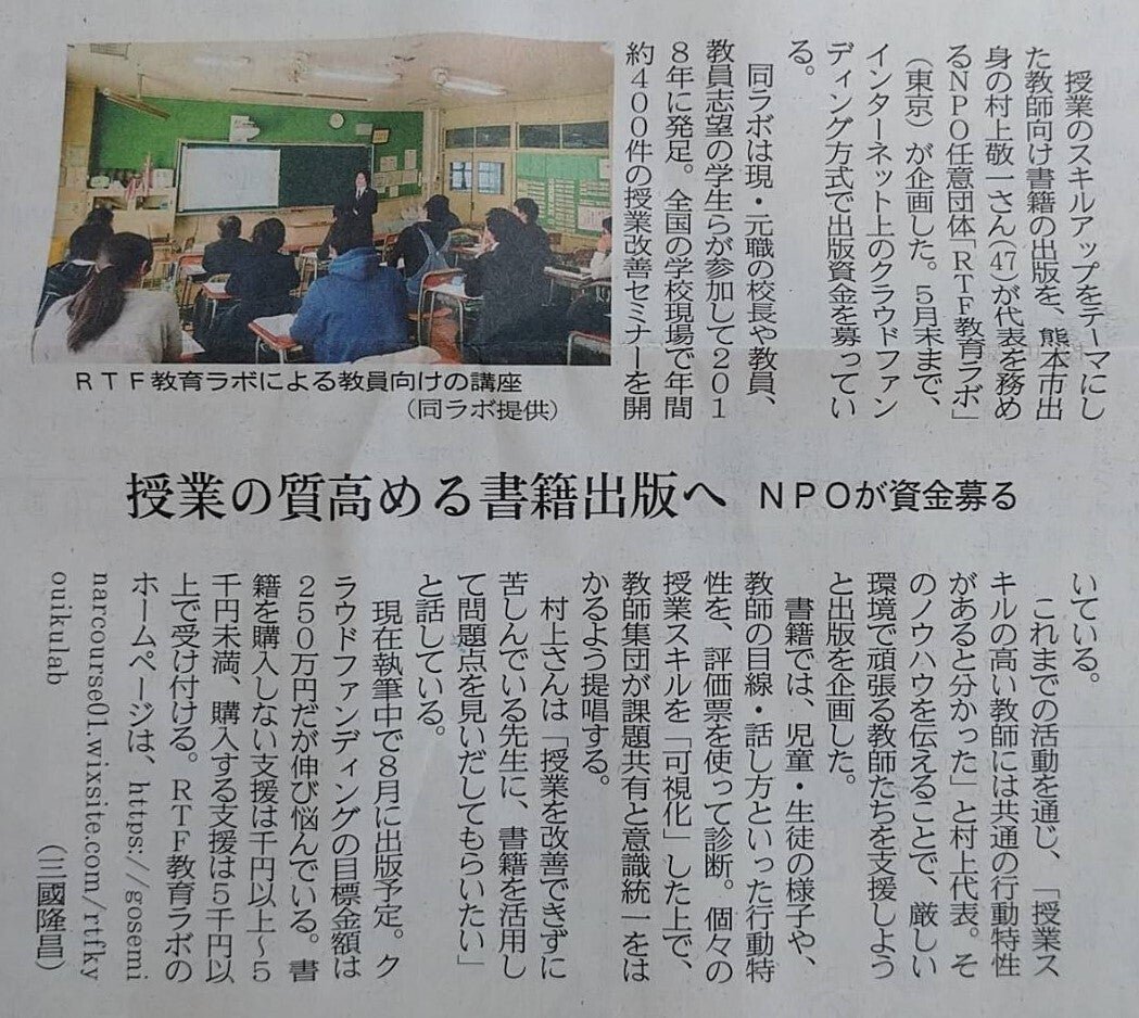 【2020年5月14日 熊本日日新聞(朝刊)に掲載されました】弊団体の活動にご理解をいただき、熊本日日新聞さまにプロジェクトについての記事を掲載していただきました。この場をお借りして、ご協力いただいたみなさまに感謝申し上げます。先生たちのため、子どもたちのため、最後まで全力で頑張ります!!