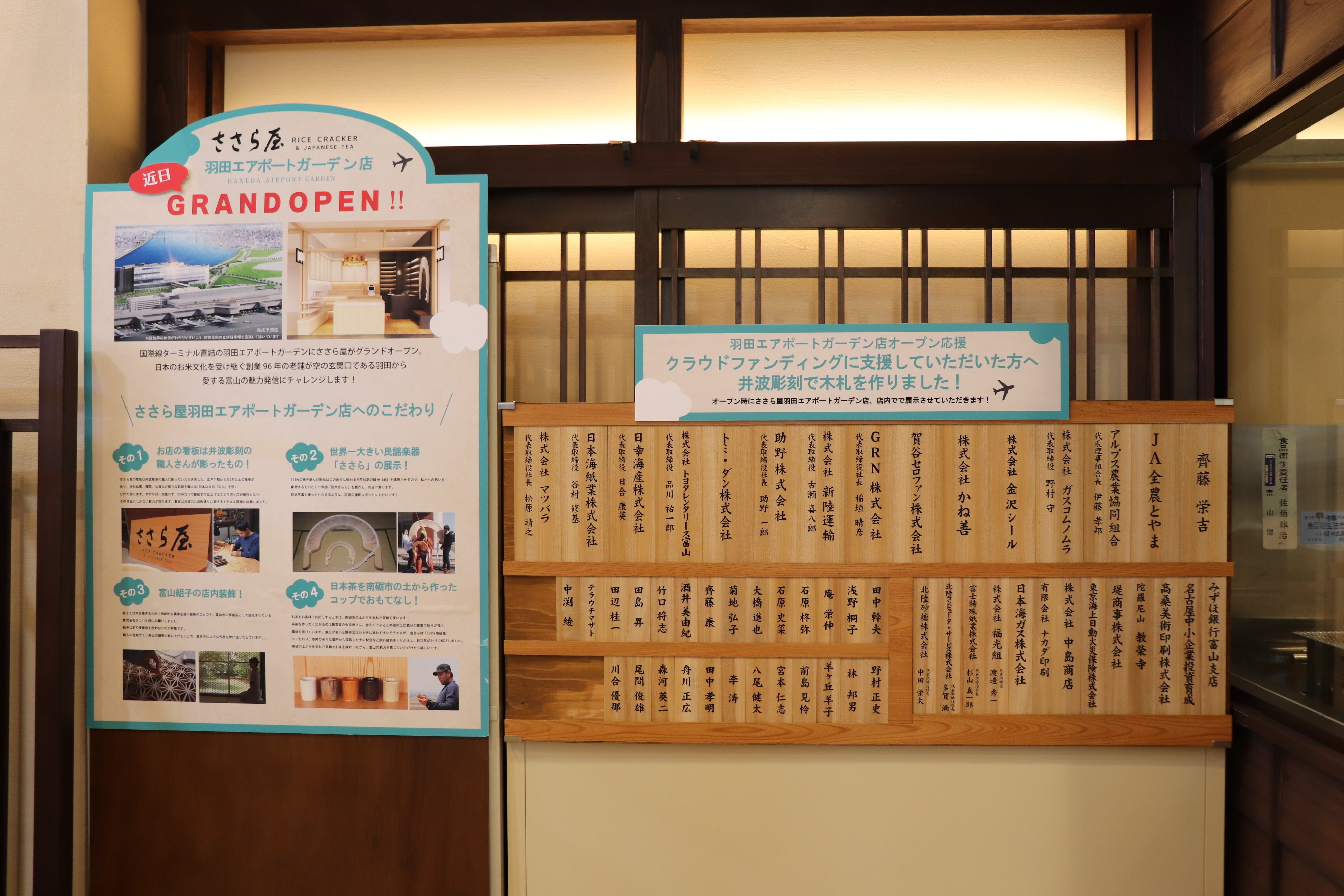 支援者の方々のお名前井波彫刻の職人さんに彫っていただいた木札を、ささら屋立山本店に設置完了いたしました。