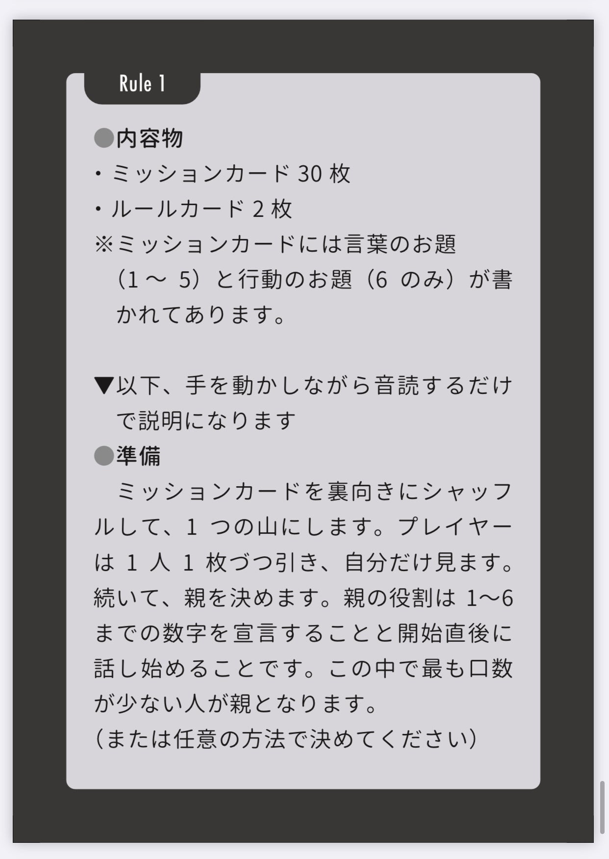 そこで私は「ボードゲームを普段やらない層」を対象としたボードゲームがあればボードゲームがさらに普及するのではないかと考え、本製品を作成いたしました。