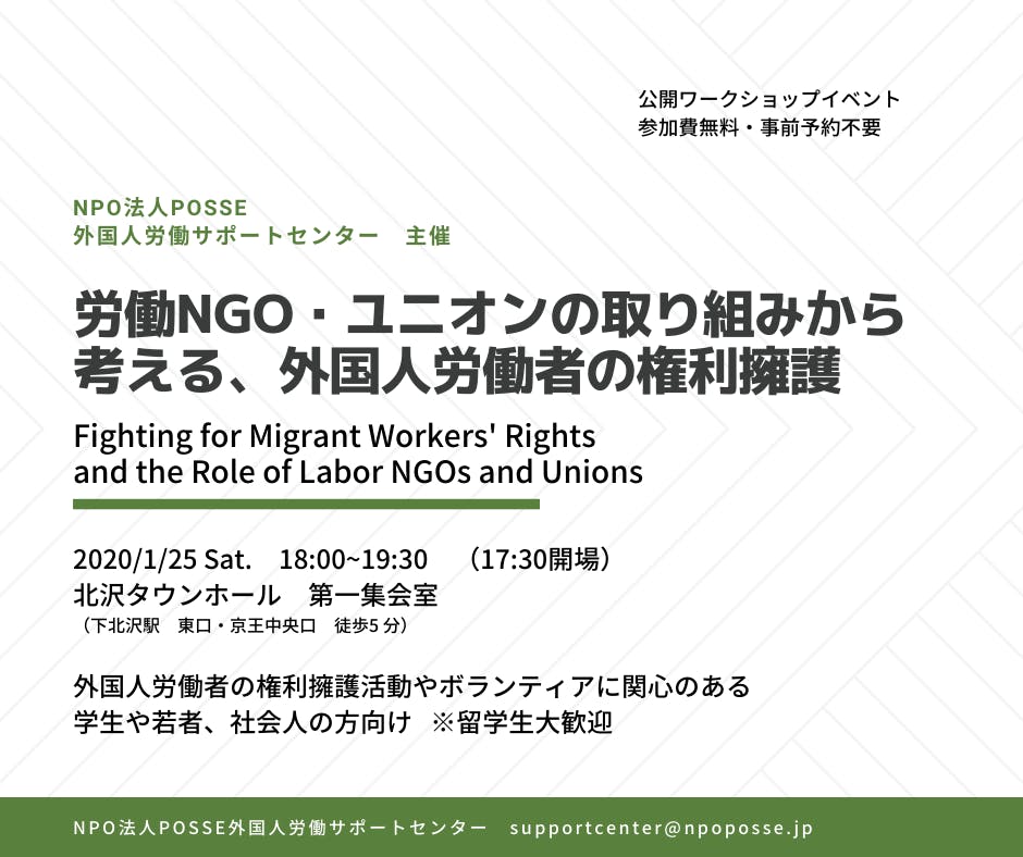 イベント「労働NGO・ユニオンの取り組みから考える、外国人労働者の権利擁護/Fighting for Migrant workers’ rights and the role of labor NGOs and unions」を開催します!