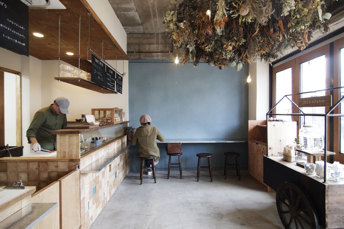 ドライフラワーのシャンデリアに、グレイッシュなブルーの壁。廃材も有効活用し、素朴で温かい雰囲気のお店です。
