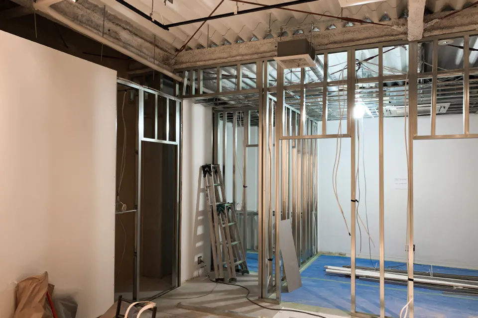 軽量鉄骨で間仕切りの骨組みを作っています。