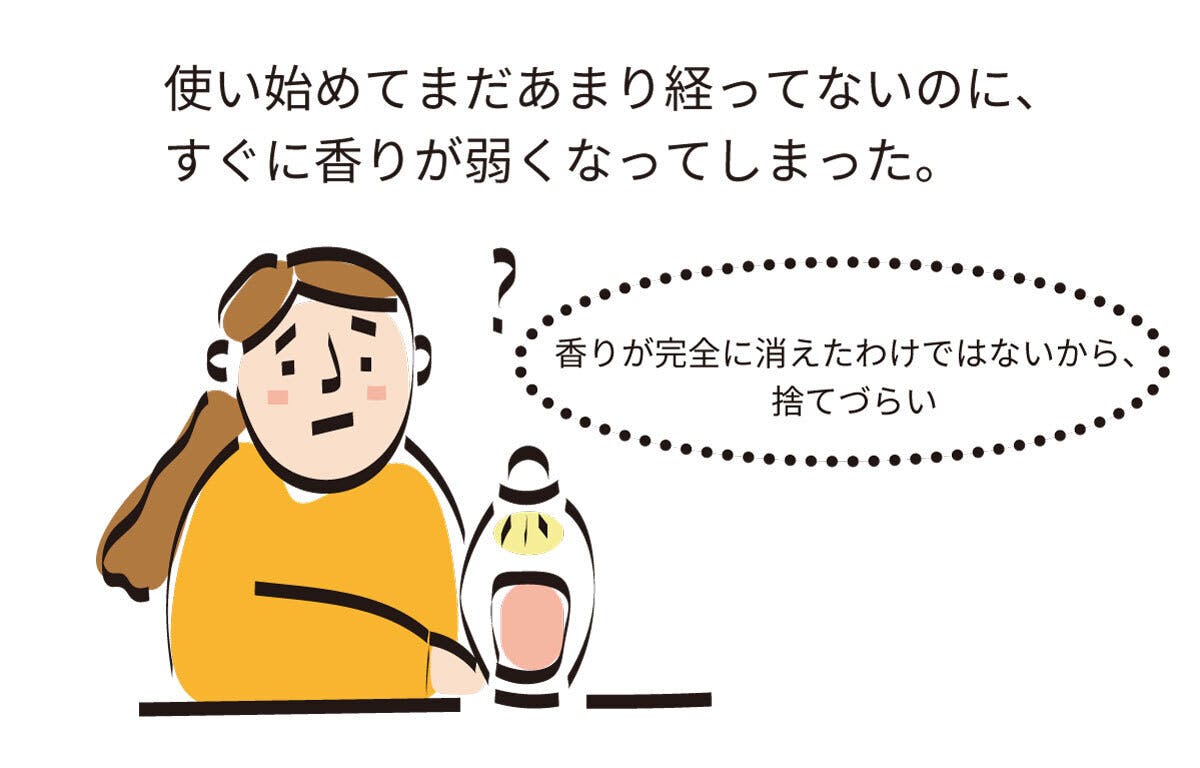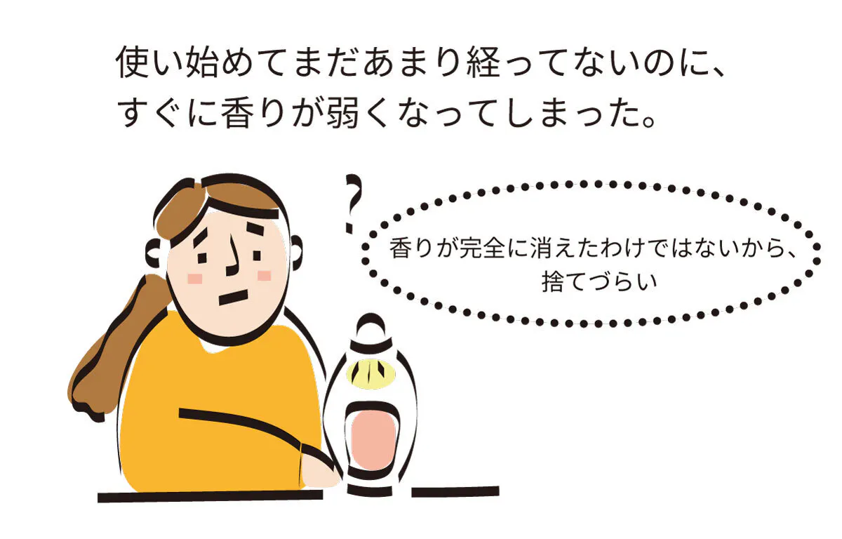 ワックスが溶けた分だけ発香しなければなりませんが、少し時間が経つと香料がワックス全体に広がってしまうことで香りが弱くなり、ワックスを捨てるタイミングも曖昧になってしまいます。
