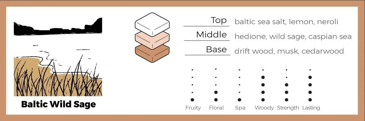 潮の香りと新鮮なセージの香りがうまくブレンドされた香りです。残り香は伊吹と藤の落ち着いたウッディな香りとほのかなムスクの香りのミックスで、男女を問わずお使いいただけます。心を落ち着かせたい時にもぴったりです。(おすすめの場所:寝室、書斎、バスルーム)