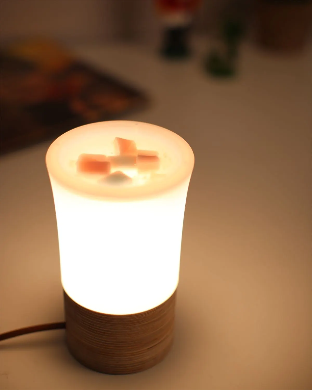 光を集め、熱い電球を遮るシェード! しかし、大体のものは光がシェードの下部分だけに集まってしまい、空間照明としての役割を果たせていないものが大半でした。そこでキューブキャンドルウォーマー<ノガ>は、半透明シリコンのシェードを採用し、光が空間全体を照らすことに成功させました。