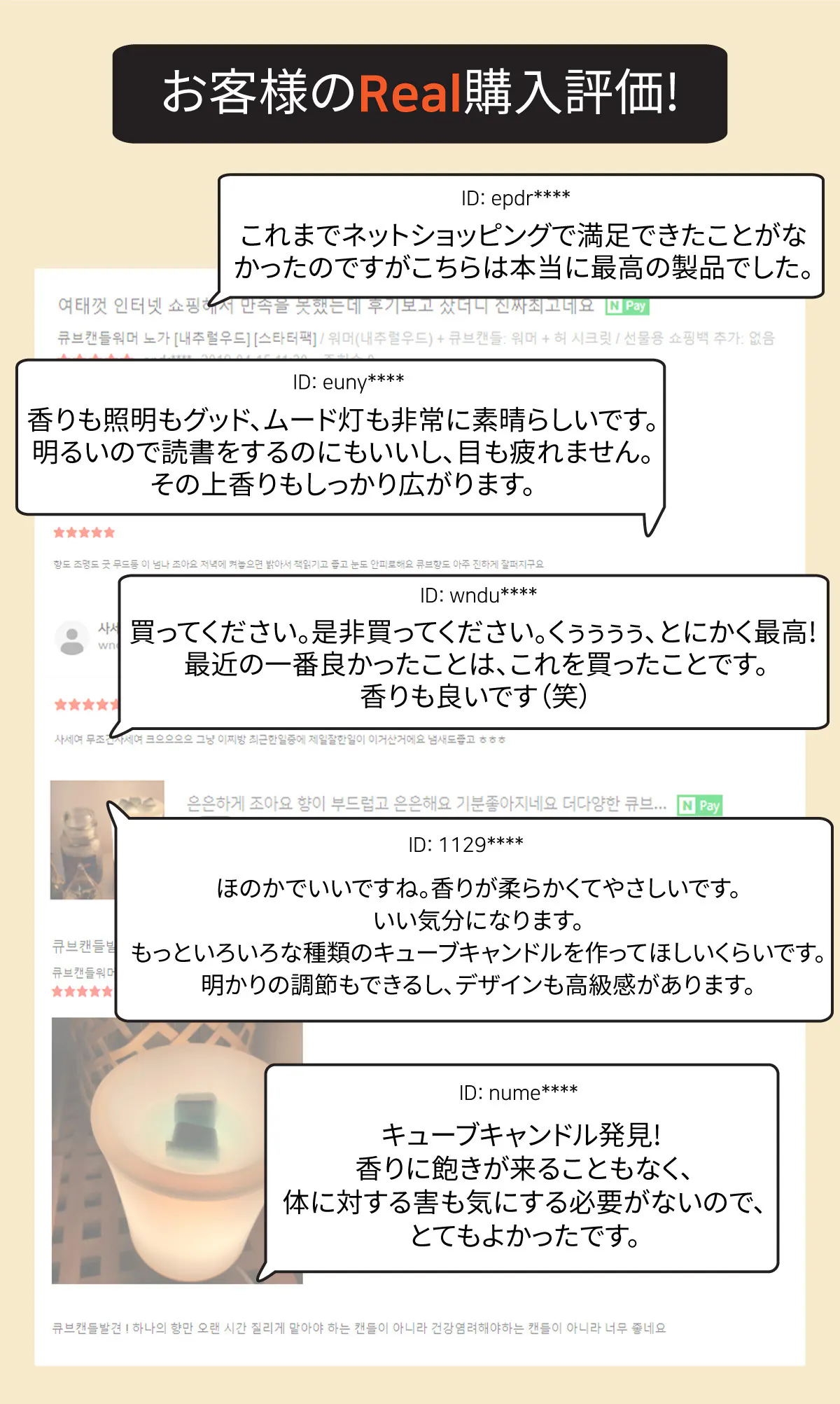 キューブキャンドルウォーマー<ノガ>を体験された方が心を込めて書いてくださったレビューからいくつかピックアップしてみました。一つ一つ読むたびに心が温まり、毎日やりがいを感じて取り組むことができています。