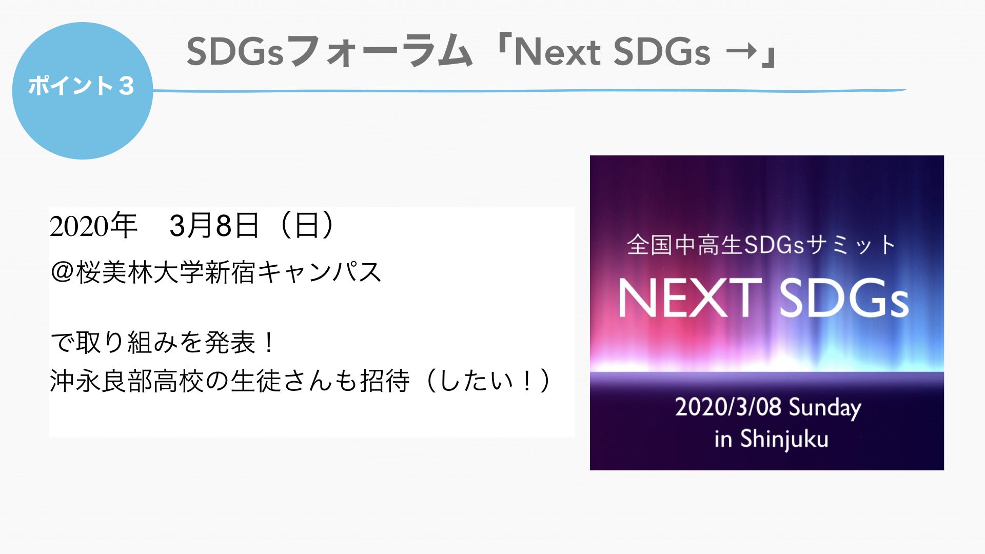 そして3つ目は環境のゴールです。地球環境は現在キープどころか悪化しています。それをゴミ拾いによって、沖永良部島の環境を維持する力に、さらにはゴミの種類を分析してゴミの発端を抑え環境の回復に繋げる道をつくっていきたいとおもっています。