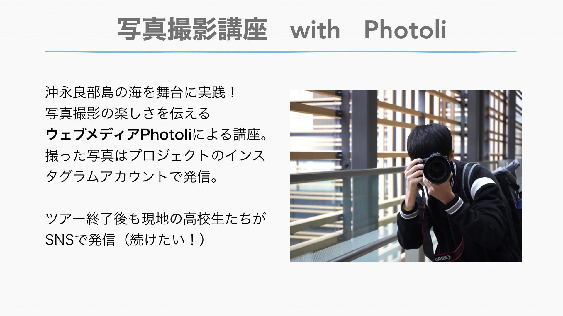 ツアーの中で僕たちや島の人たちが撮った写真を通して、様々なメッセージを発信します。そして、今度は沖永良部の中高生たちを僕たちの地域にも招きたいと考えています。