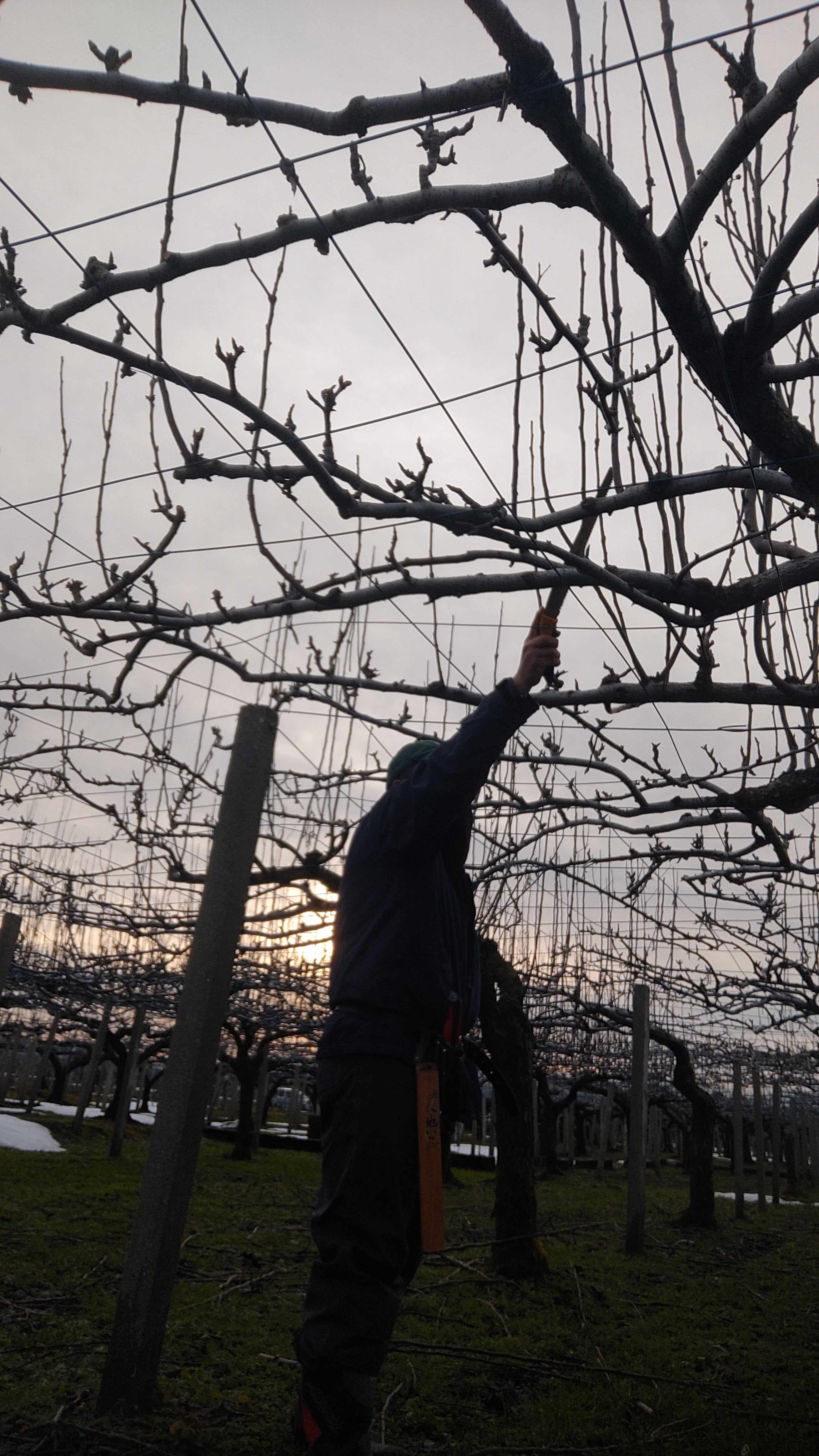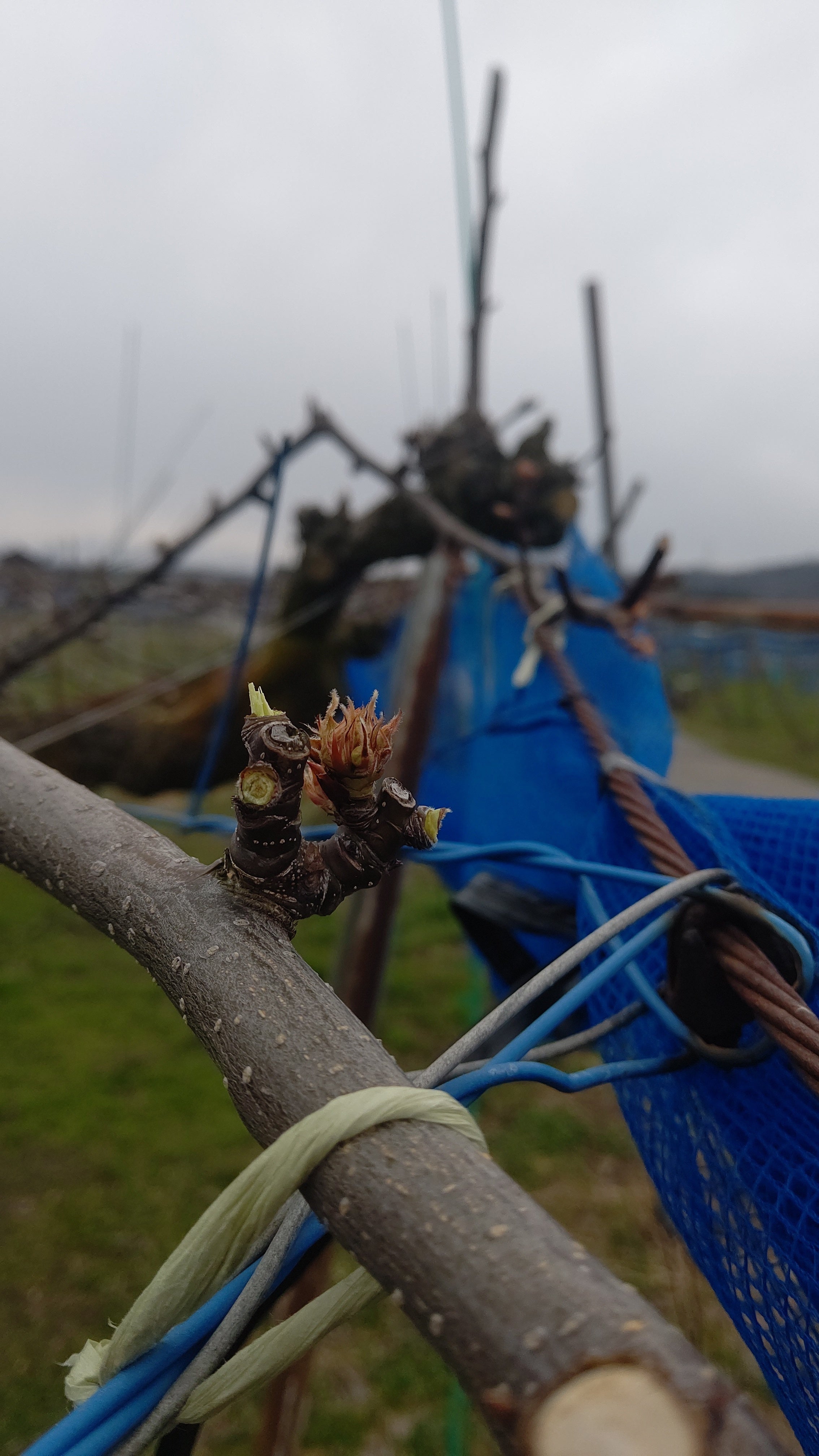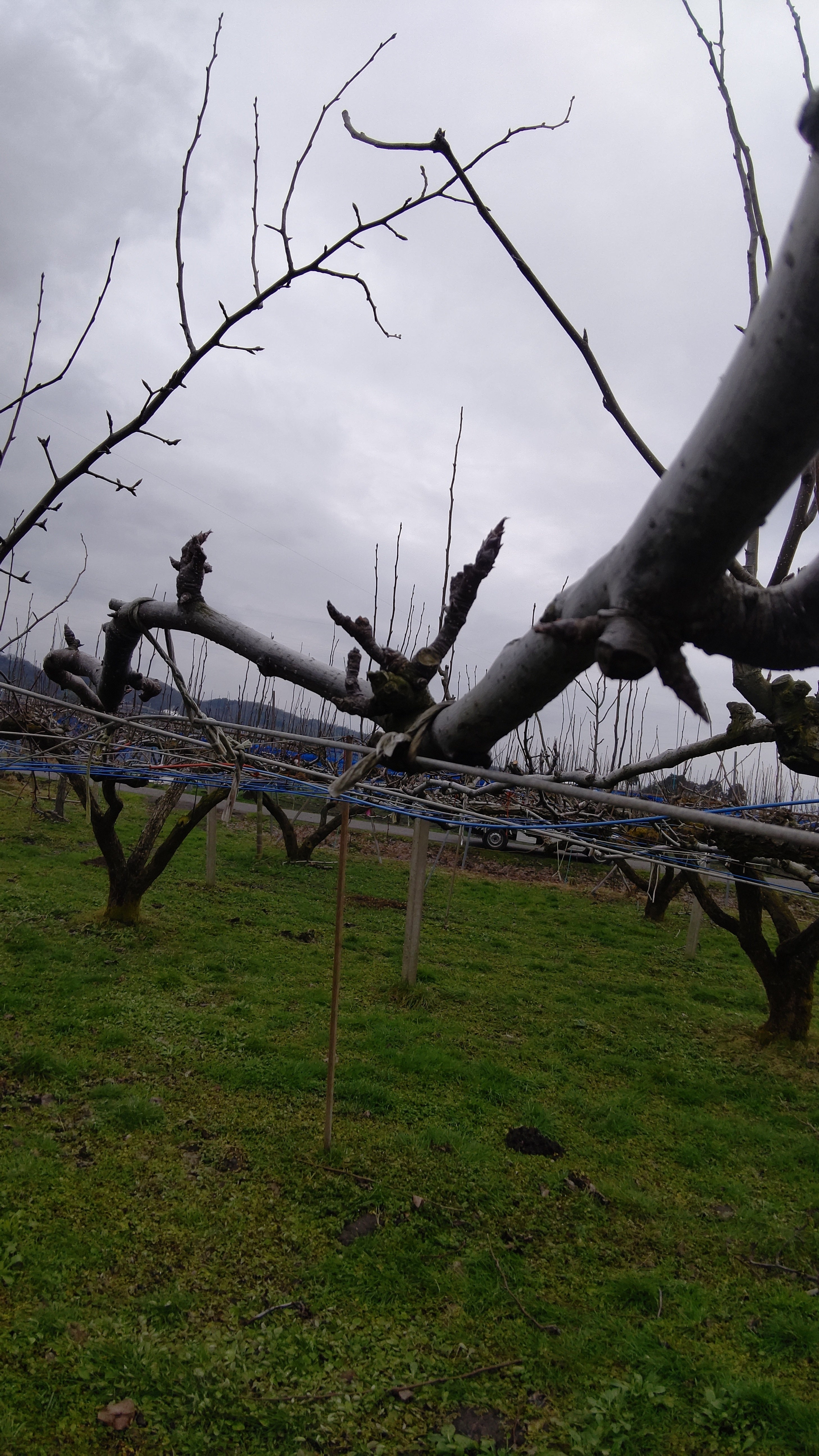 ご支援ありがとうございます。かきです。もう3月になります。いや、やっと3月が来た感じです。2月が長いという感じは、人生40年幾年なかなかないです。というのは、剪定(せんてい)がようやく終わるからです。昨年10月から作業してきました。ようやくおわるな~、としみじみしていても、まだ誘引(ゆういん)という作業がまっています。写真のように、枝を棚線に縛り付ける作業です。縛り方は「おとこむすび」という方法です。一昨年初めて、この縛り方を習ったときに、なんとなくかっこいいな、と思いました。結んでいるしぐさが、仕事しているぞ、と魅せられました。この先、4月の半ばに花が咲きます。そこから、8月までなんやかんや作業が待っています。がんばりすぎないようにがんばります。では、また。