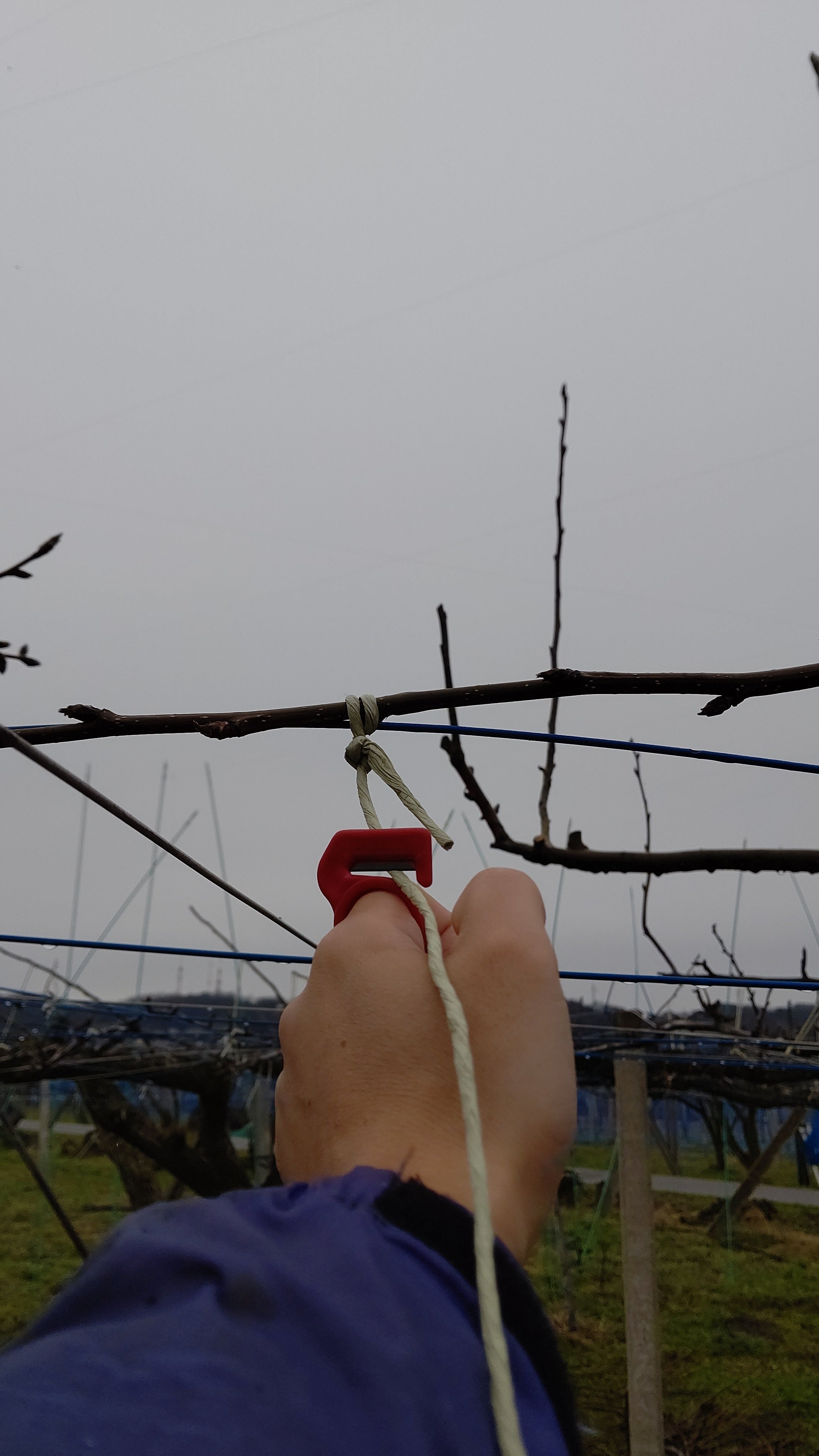 ご支援ありがとうございます。かきです。うなずきトリオの「うなずきマーチ」を聞きながら、投稿しています。パソコン1台で音楽を聴けるなど、様々な情報を仕入れることができる世の中になりました。つくづく便利な世の中であります。さて、誘引(ゆういん)作業に入っています。3/1にやっと剪定(せんてい)が約150本終わりました。誘引は、写真のように棚線に枝をしばり、農薬をかかりやすく、葉っぱの光合成をしやすいように枝の配置を考える作業でもあります。写真は、「アイアイカッター」という紐を切るための道具です。指輪のように指にはめます。わざわざハサミを手にすることがない便利な道具です。一人作業は、道具や機械が友達です。いなくなると途端に効率も落ちて、悲しくなります。でも、がんばりすぎないようにがんばります。では、また。まだまだ春は遠いです。