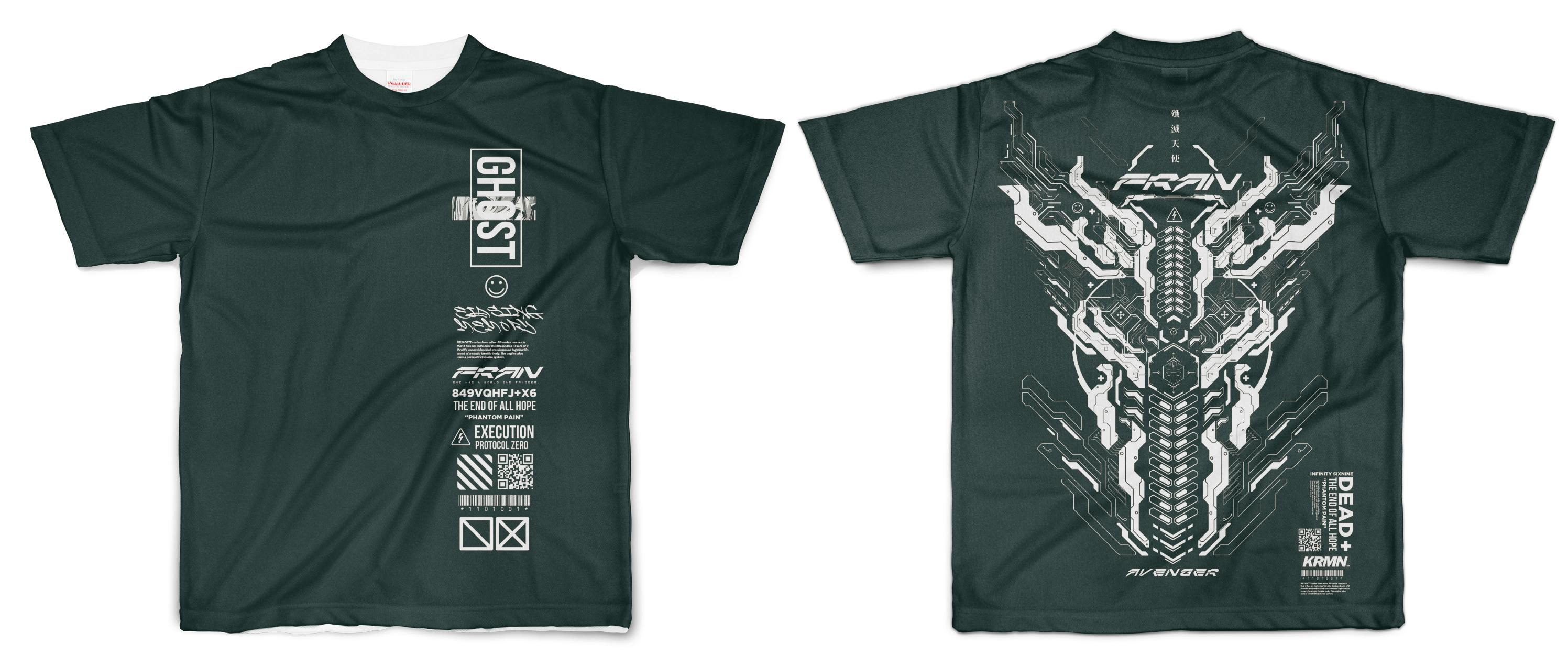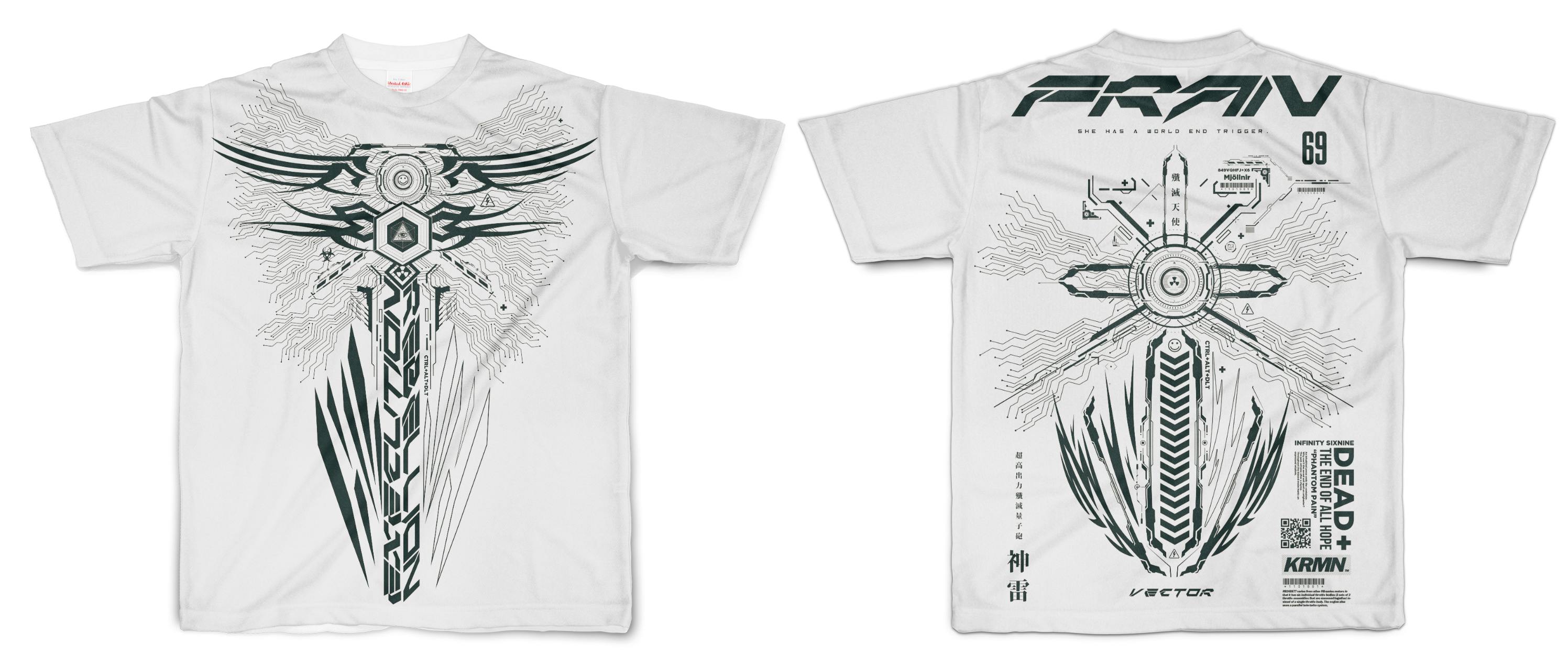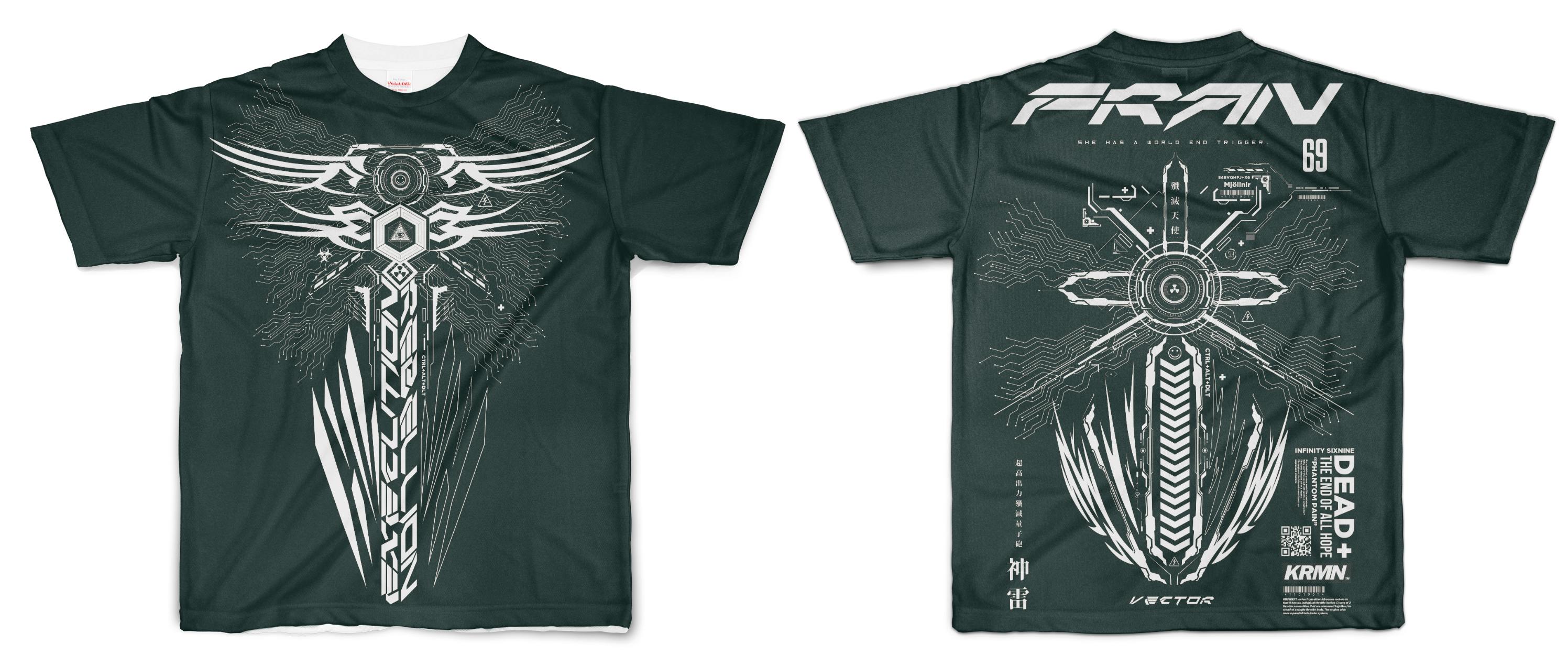 背中に書いてある「FRAN」は左腕が超強力なすごいビーム砲になっている機械みたいな女の子の名前という設定です。もしかしたらブランド名になるかもしれません。