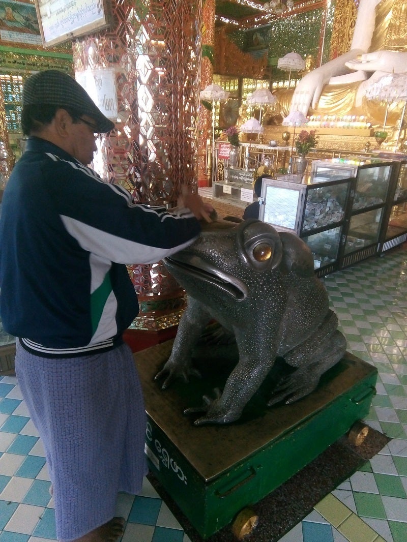 ※ザガイン山は山の形がカエルに似ているため、カエルを祀っています。お寺の管理者の方が説明してくださっている様子。