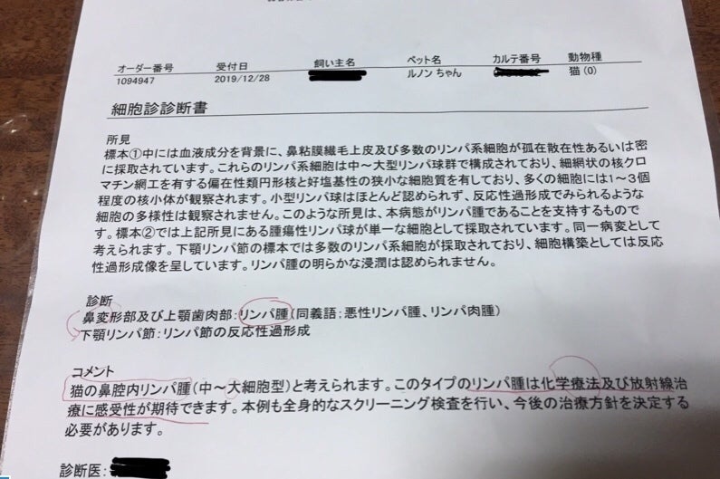 治療としては、抗がん剤の注射を毎週実施、効果を見て6か月を目途に方針を再検討する予定となりました。