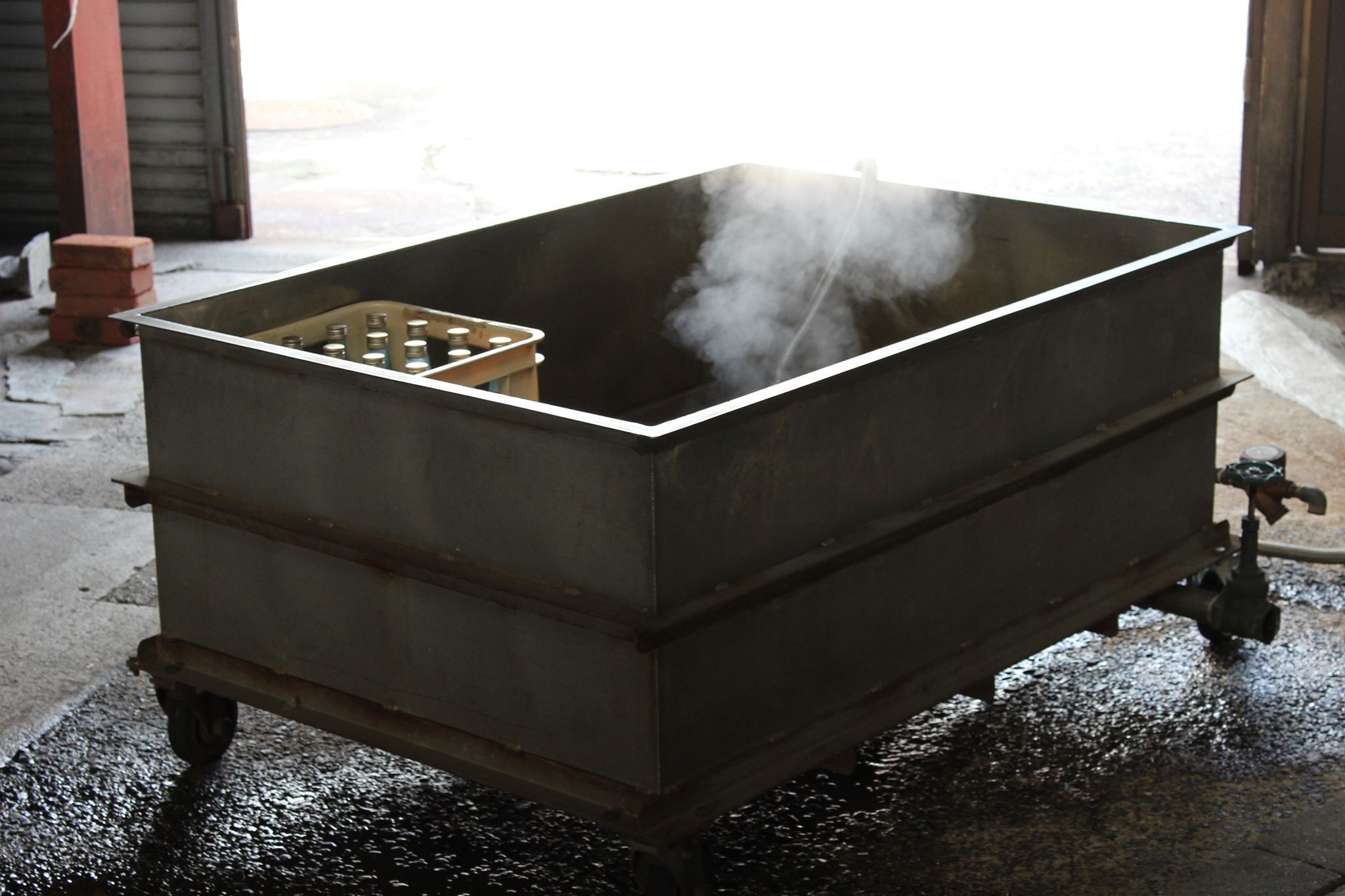 また、順次写真のプールに湯を張って、瓶詰め後の火入れをしています。