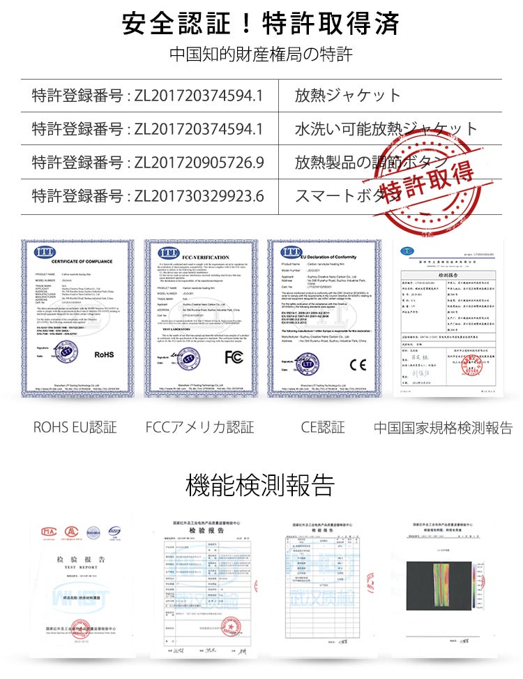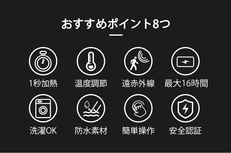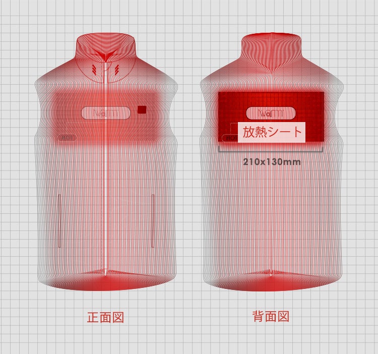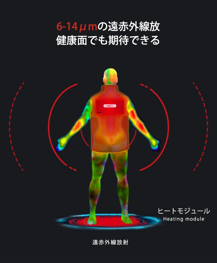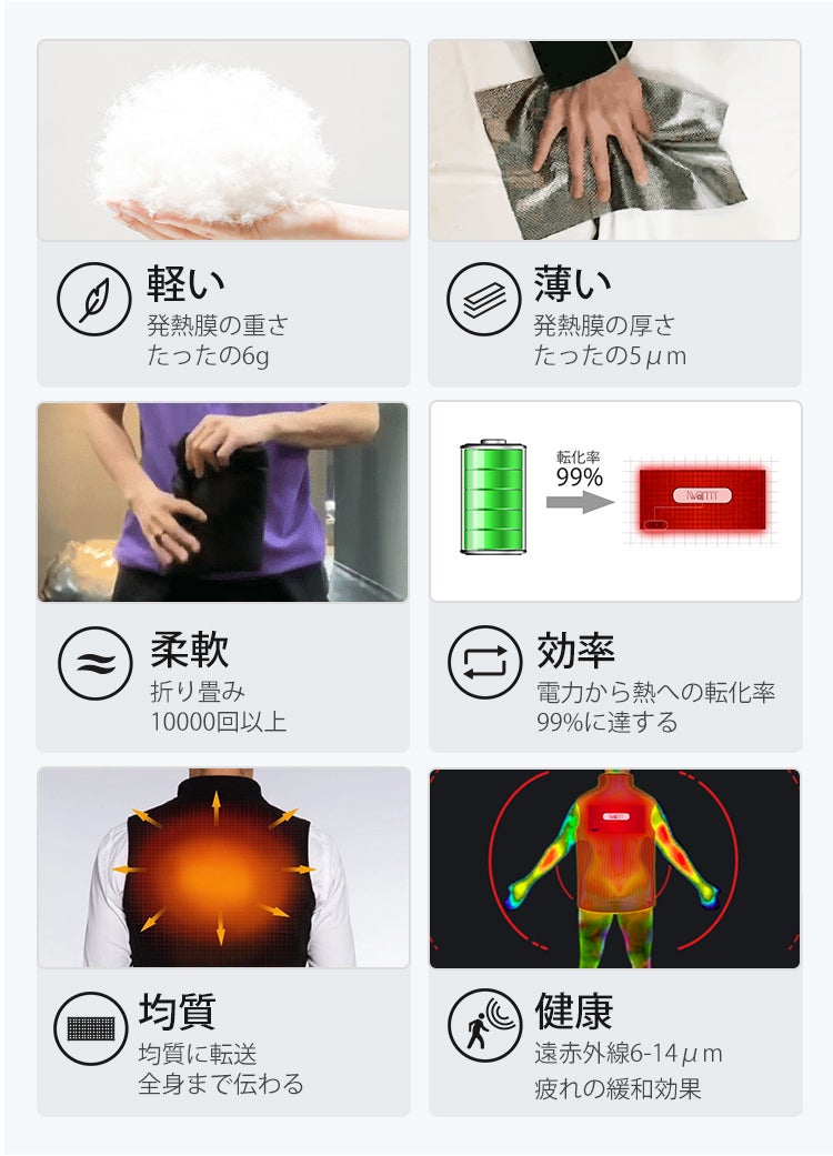 優れた保温材質であるカーボンナノチューブを採用し、最新のiwram技術を搭載した放熱シートが背面に内蔵されています。ナノレベルの空間の温度も逃さずに電力を熱に転化させることができ、電力から熱への転化率は驚きの99%。ほぼすべての電力を熱に変え、あたたかく身体を包み込みます。