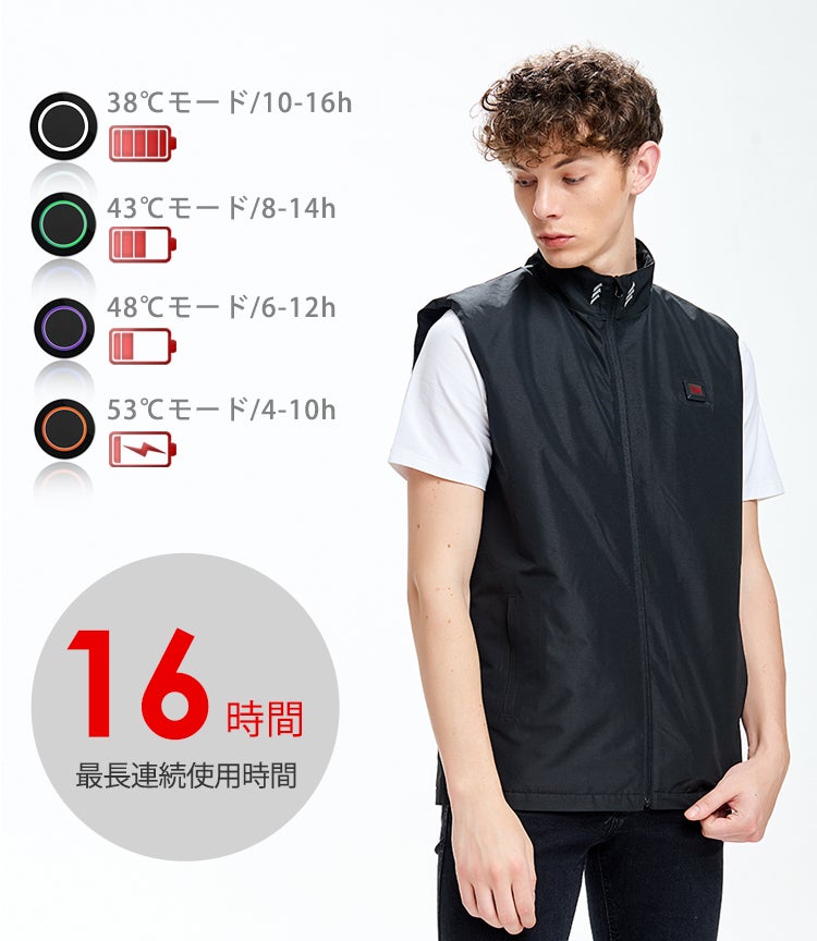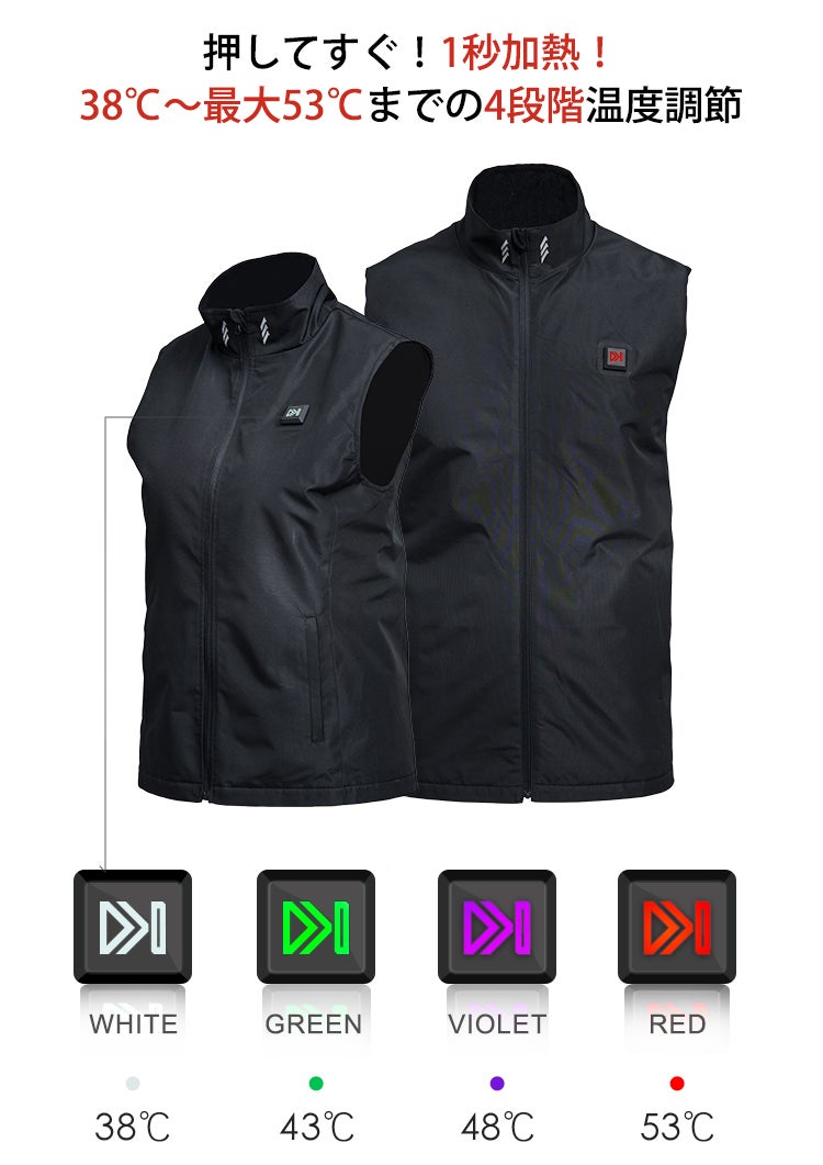 温度は38℃~最大53℃まで、環境に合わせて4段階に調節が可能。胸元のボタンを押すだけで調節することができ、ライトの色で発熱温度を教えてくれます。1回押すごとに「レッド」→「パープル」→「グリーン」→「ホワイト」→「停止」の順で切り替わり、簡単に発熱を停止できる為、火災事故等に繋がる心配がなく、安心して使用することができます。