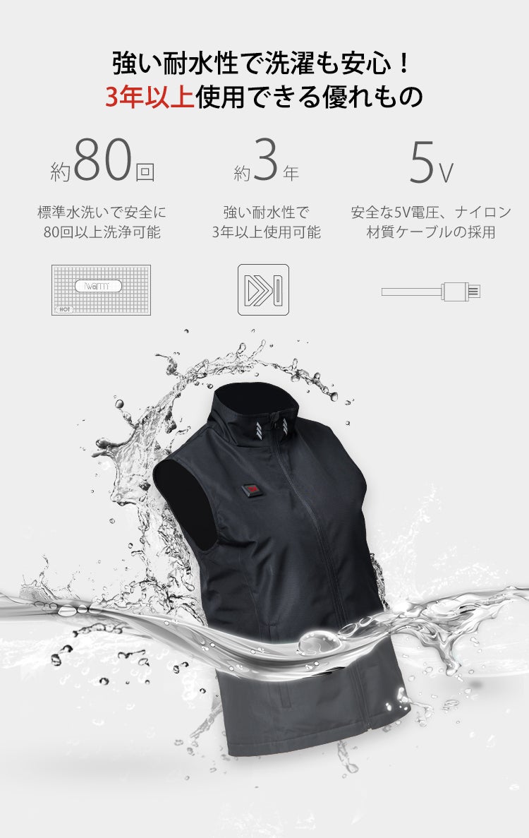 器具やケーブルが搭載されておりますが、本体すべてが耐水性に優れています。ケーブルにも防水のナイロン材質を採用しているため、そのまま自宅で洗濯OK。水に浸して洗っても加熱機能に問題はまったくありません。標準水洗いで約80回以上の洗浄、約3年以上の使用が可能です。