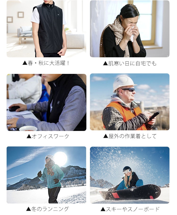 袖がなく動きやすい為、少しだけ温まりたいスポーツやランニングのほか、まったり過ごしたい部屋着や仕事着にもピッタリ。熱くなったり寒くなったりしても、ボタンひとつで温度調節できるのでシーンに合わせた温度で快適に過ごせます。