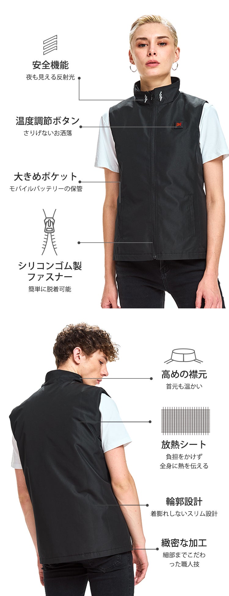 また、放熱シートは負担をかけないたった6g、5μmのコンパクトサイズ。驚くほどの軽さ&薄さを実現し、普通のベストとして春や秋にも気軽に羽織ることができます。