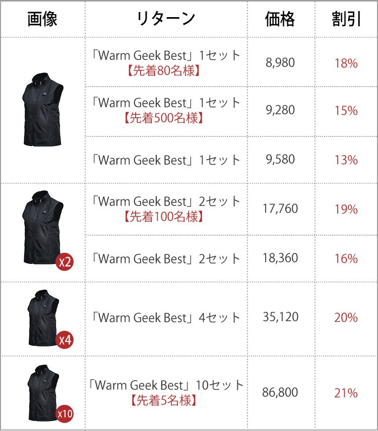 2020/02/24 17:05ご支援いただいた皆さま、こんにちは。雲集商事株式会社でございます。この度、1秒で暖かく!春も秋も活躍する薄さ&軽さ!あったかヒートベストWarm Geek をご支援頂き、ありがとうございます。リターン商品の発送は予定通り、今週中、皆様宛に送付いたしますが、ほかのプロジェクトには、『住所記載ミス』や『引っ越し』等で、商品戻りが発生しております。円滑の商品をお届けさせて頂きたいので今一度、配送先の住所確認のご協力をお願いします。お申し込み時にご指定いただいた配送先は、マイページよりご確認いただけます。変更があった場合は、今週水曜日(26日)までに、マイページより住所変更の手続きをお願いします。今後ともをよろしくお願いいたします。雲集商事株式会社スタッフ一同 もっと見るプロジェクト終了!&住所確認をお願いします。