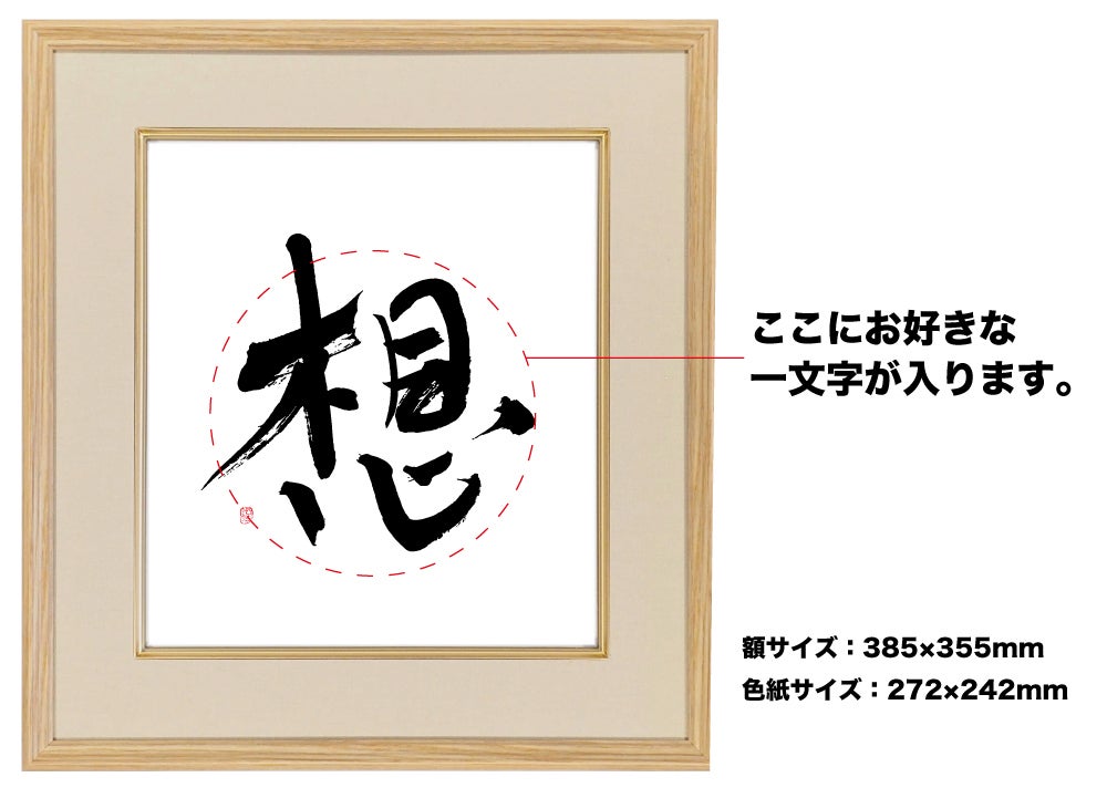 リクエストをいただいた一文字を色紙に書いて額装してお届けします。