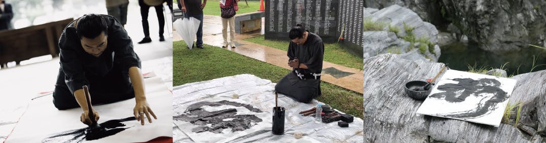 2007年から始めた活動は現在多岐にわたり、10年の歳月を経て「祈り」というテーマにたどり着きました。そして、2017年の三重県護国神社への「奉納」を皮切りに、たくさんの場所で「祈り」をカタチにしています。2018年に「日本のはじまり」の地と言われる橿原神宮へ作品を奉納し、2019年には30年ぶりの大雨となった沖縄慰霊の日を訪れ、慰霊碑を前に書かせていただきました。