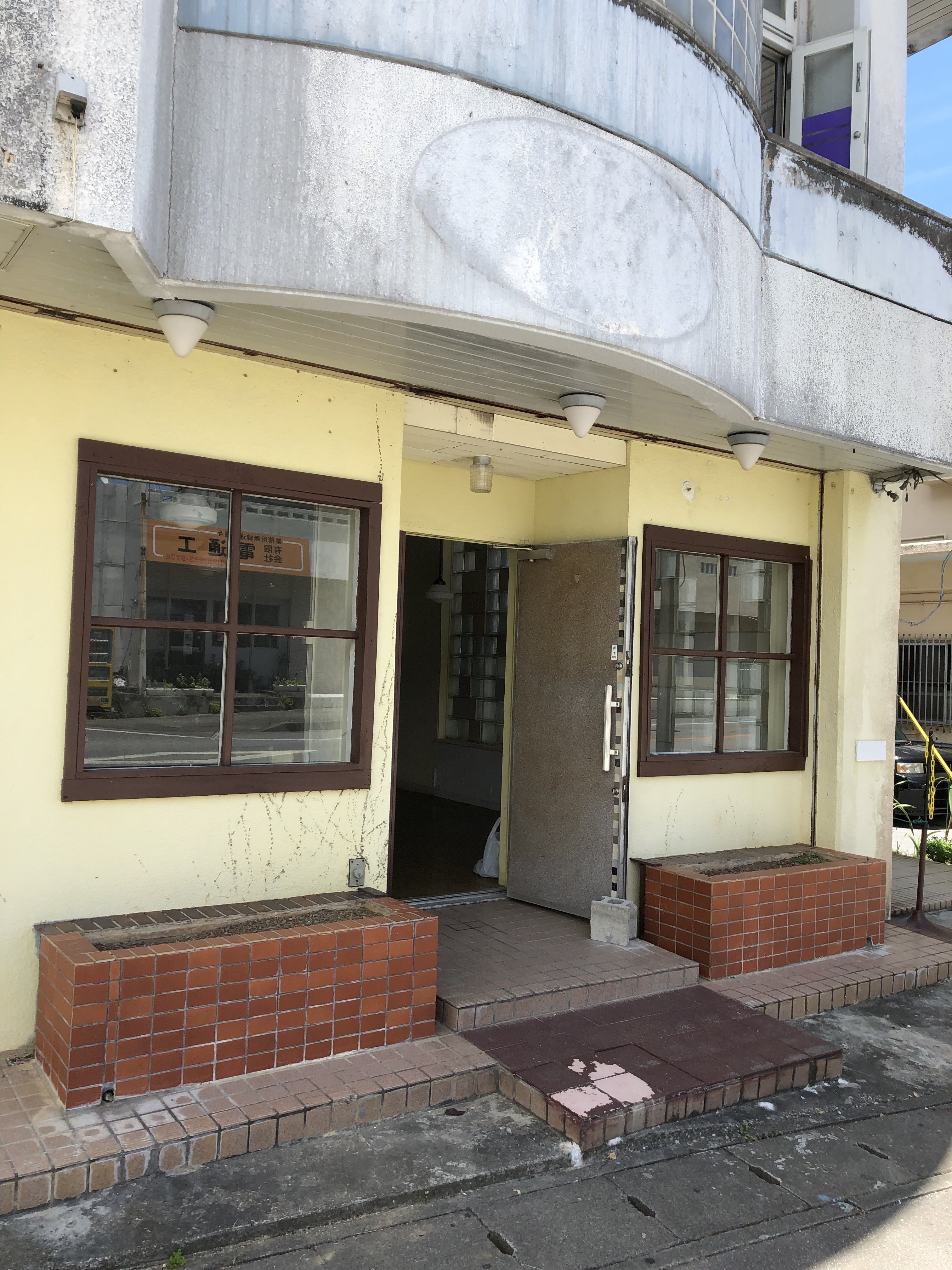 外壁も大家さんには失礼ですが、ボロボロです。ドアもスナック調の古く厚いドア。タイルも、、、