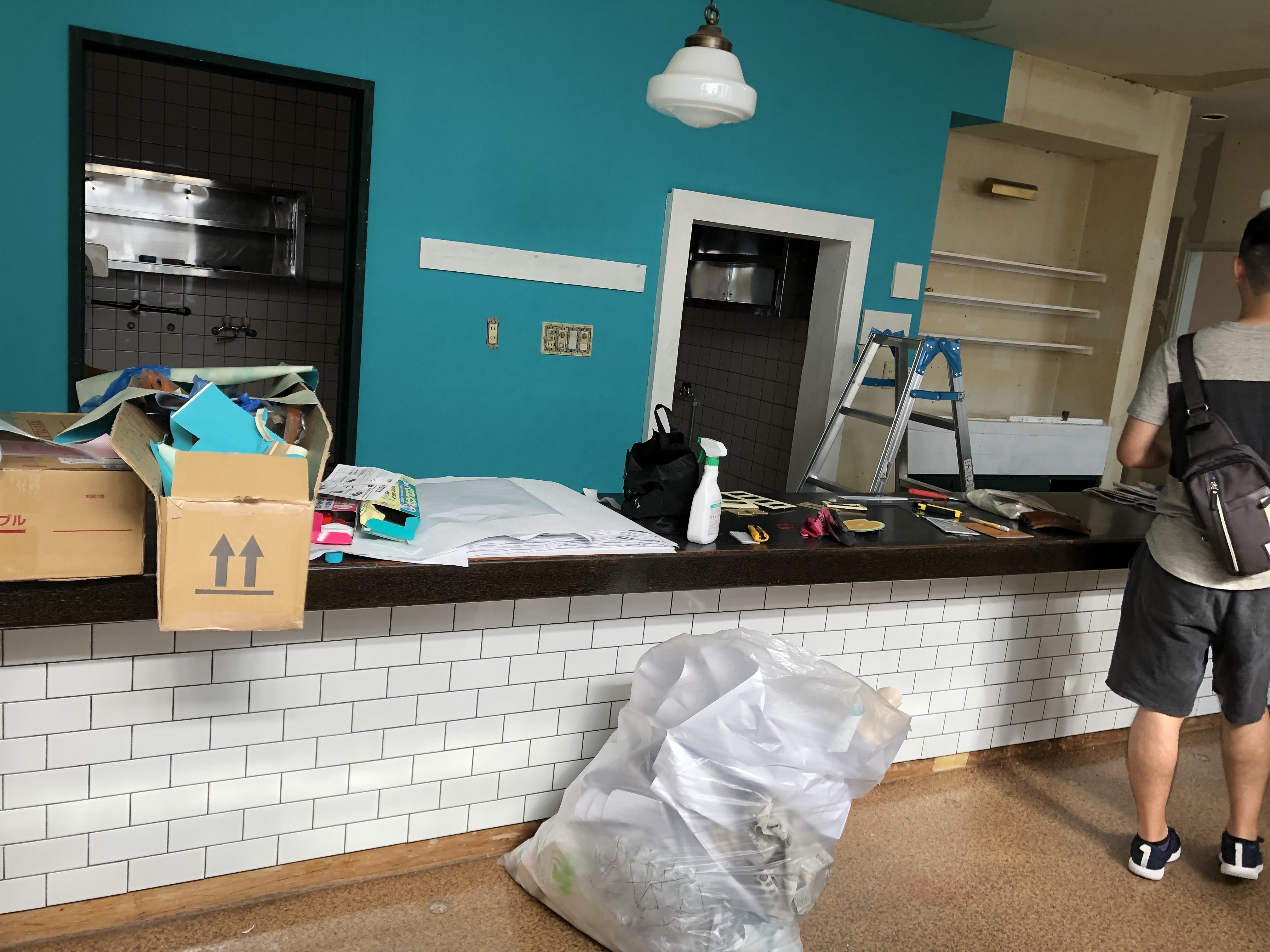 カウンター リフォーム中(壁紙を自分たちのお気に入りの色に張替え、カウンター下もタイルを一枚、一枚貼り付けました)
