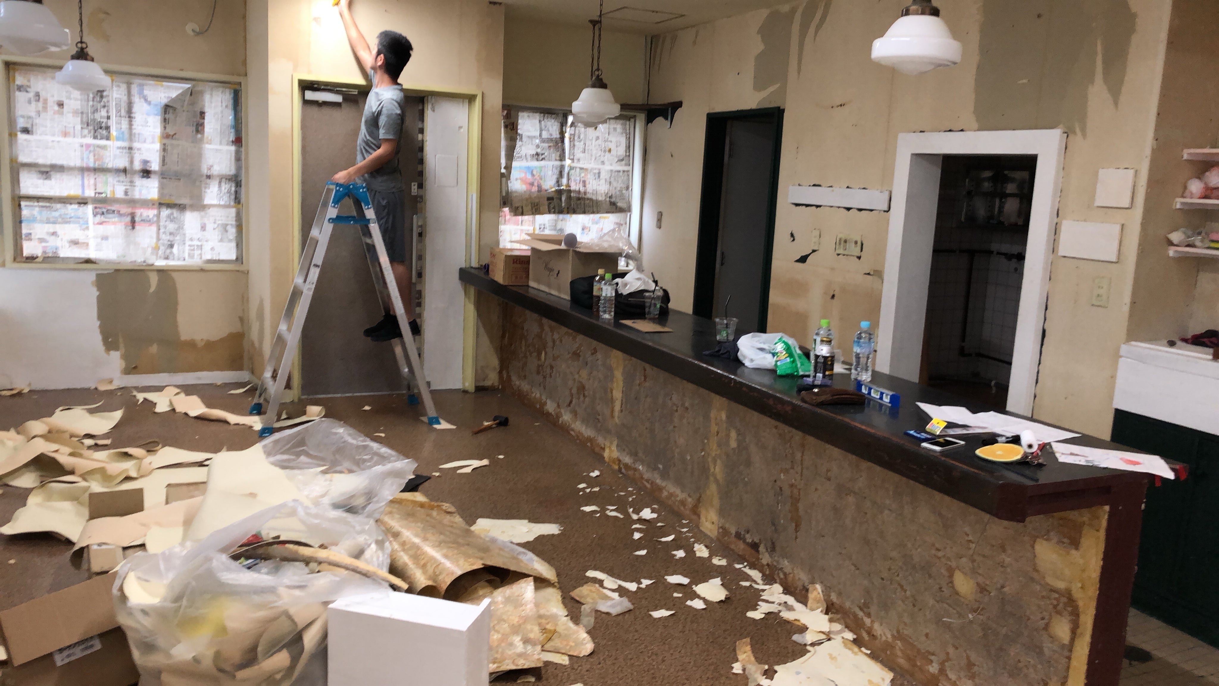 壁紙をぜーーんぶはがし、ゆかをはり、