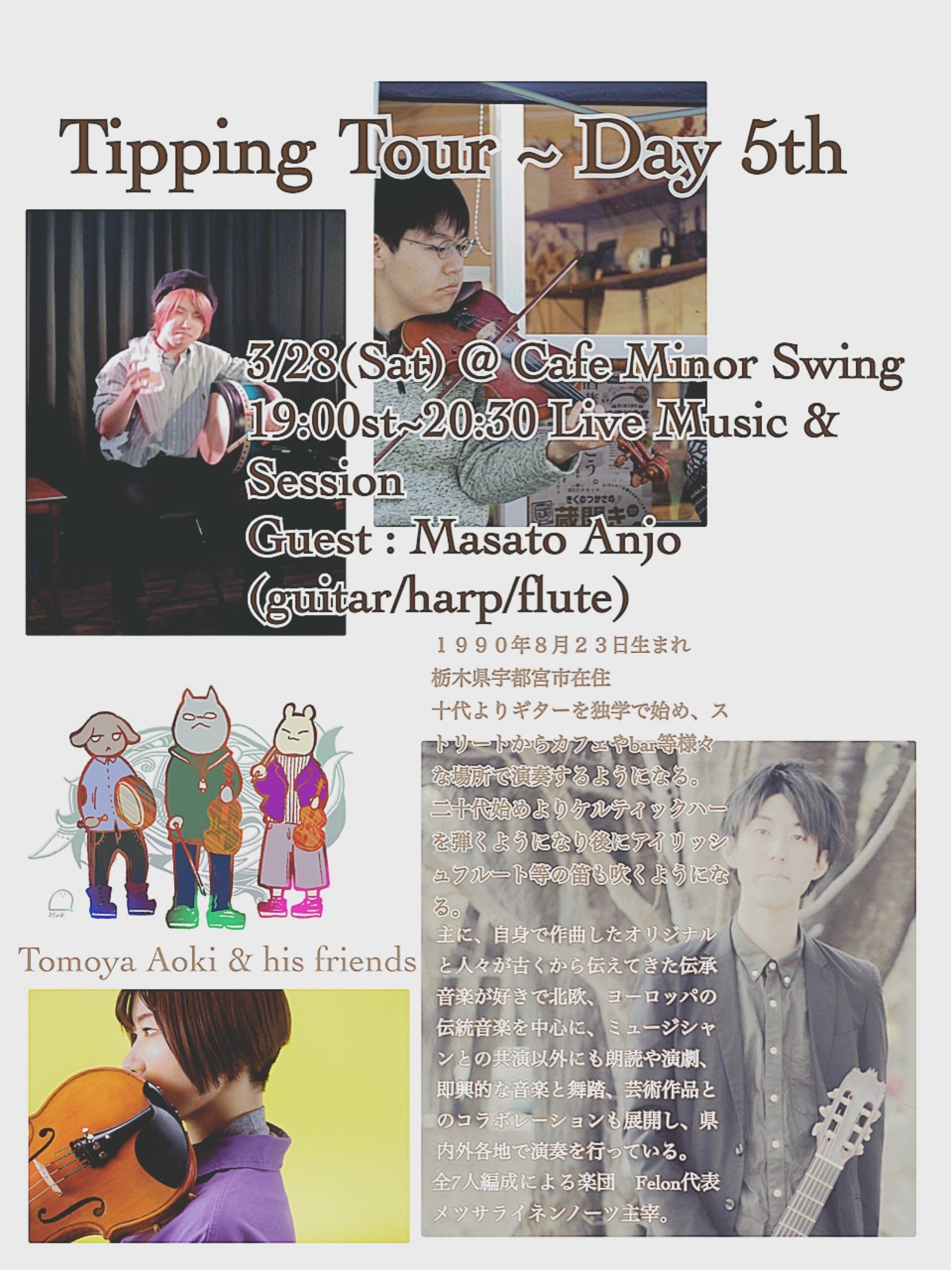 京都、名古屋、長野、東京、宇都宮にて。既に会場と共演者とライブ後セッションは確定済みです。