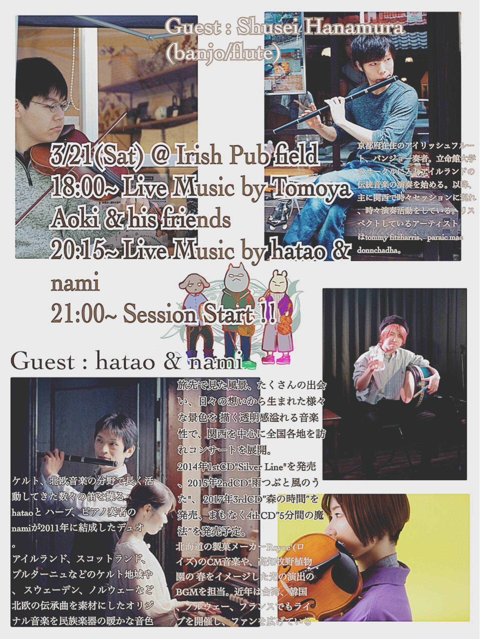 2016年より定期的に京都市内のアイリッシュパブにて金曜のセッションライブの演奏メンバーを担当し始める。徐々に定例化し、現在はアイリッシュパブGnome、アイリッシュパブDublinでのセッションライブに主に呼ばれる。