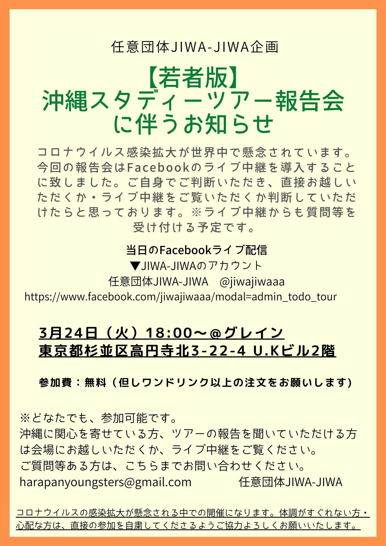 2020/03/20 09:00皆さま、こんにちは。3月24日(火)に実施予定の沖縄スタディーツアーの活動報告会についてお知らせです。新型コロナウィルス感染拡大に伴い、今回実施する活動報告会ではJIWA-JIWAのFacebookページからライブ中継で報告会に参加していただけるようなりました。先日お知らせしました、Grain(グレイン)でも当日報告会は開催いたしますので、当日直接会場にお越しいただくか、ライブ中継で報告会に参加するかは、ご自身の判断にお任せしたいと思います。また、Facebookのライブ中継でも、ご質問等承ります。<<Facebookライブ中継の参加方法>>3月24日(火)18時になりましたら、JIWA-JIWAのFacebookページをご自身のスマートフォンやパソコンでご覧ください。JIWA-JIWAの新規投稿にライブ中継の投稿がアップされますので、そちらで視聴していただけます。▼JIWA-JIWAのFacebookページhttps://www.facebook.com/jiwajiwaaa/?modal=admin_todo_tour【※当日直接会場にお越し下さる方へお願い】1. JIWA-JIWAのメンバー一同、活動報告会当日は感染症対策(マスク着用、換気の徹底など)いたしますが、万が一当日体調がすぐれない方・体調が心配な方は、Facebookのライブ中継よりご参加願います。また当日会場にお越し下さる方は、可能な限りマスク着用をお願いいたします。2. 当日直接会場にお越し下さる方の参加人数を把握するために、下記のURLより参加フォームの記入をよろしくお願いいたします。▼活動報告会参加フォームhttps://forms.gle/KJSDndu2UTjgfWyr9当日につきまして、ご質問等ございましたら下記のメールアドレスよりお問い合わせください 。▼メールアドレスharapanyoungsters@gmail.com もっと見る