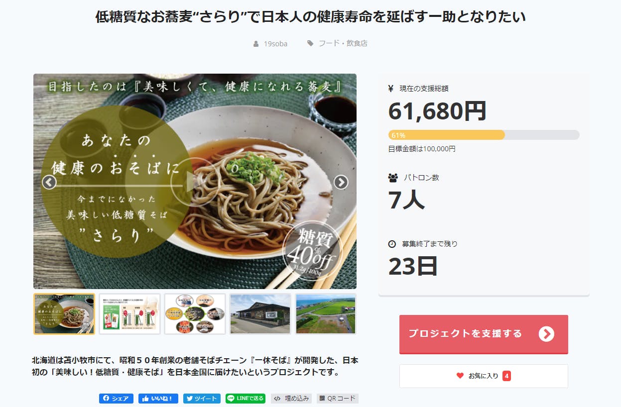 2020/03/07 14:15お世話になっております! 低糖質だったん蕎麦「さらり」のプロジェクトにご支援いただきました皆様、ご検討中の皆様、誠にありがとうございます!2月1日にプロジェクトが開始してから早いもので37日が経過しました。今現在61%達成しております!残り39%…!残り23日…!ご支援を検討されている方は、是非ご支援よろしくお願いします!引き続き、当プロジェクトのご支援・拡散へのご協力もよろしくお願いします。☟QRスクショで簡単シェア★一休そば 早川 陽介 もっと見る