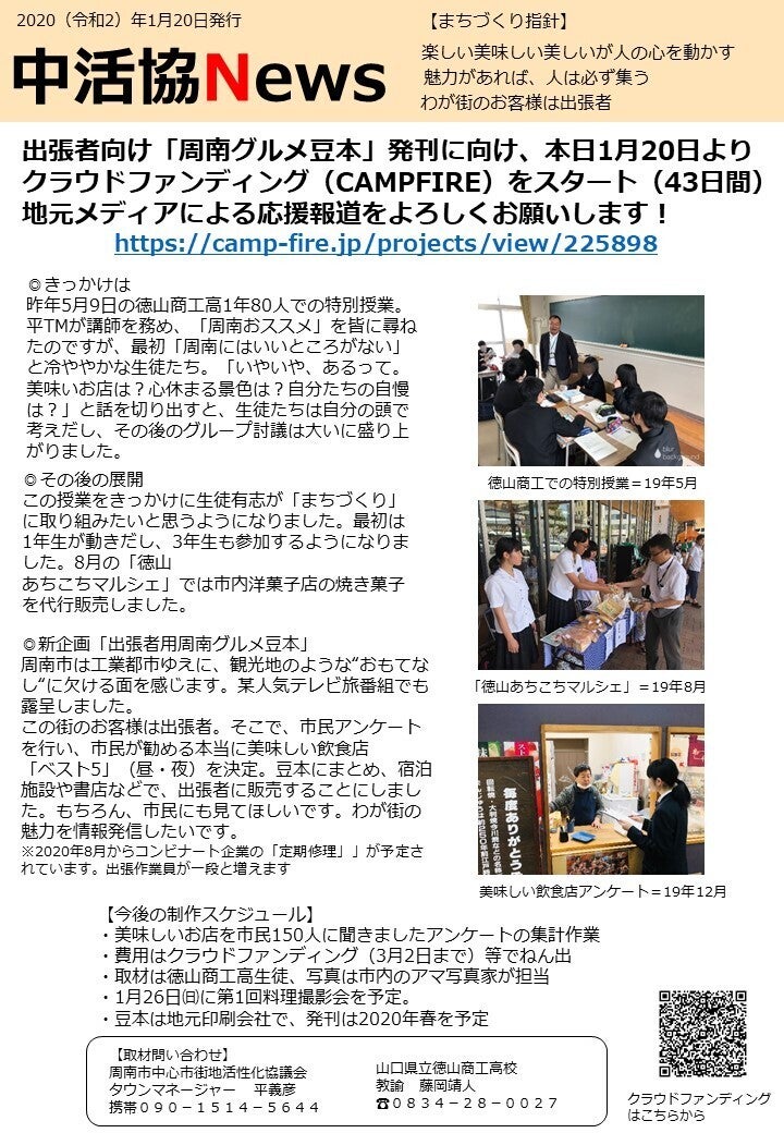 本プロジェクトのきっかけは昨年5月9日の特別講義。山口県立徳山商工高校の1年80人に「周南おススメ」を尋ねた。最初は戸惑っ生徒たちも自由に自分が好きなお店や風景、母校を発表してくれた。この数週間後、感想が届くとともに、数人の1年生が「まちづくりに参加したい」との申し出があった。心底驚いた。思いを聞いてみると、同校は卒業後、地元の企業に勤める比率が高い。なので、卒業してからも、まちづくりに関わりたいという。うれしかった。これがすべての始まりでした。