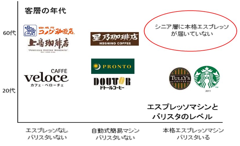 コーヒー業界で客層の区分化が進み、シニア層に本物のエスプレッソコーヒーが届いていない。シニア層にエスプレッソコーヒーのニーズがないのではなく、高額であるエスプレッソマシンにコストをかけたくないという企業側の理屈だと考えられます。