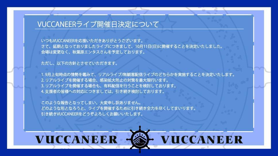 2020/07/20 19:00支援者の皆さまへいつもVUCCANEERを応援いただきありがとうございます。さて、延期となっておりましたライブにつきまして、10月11日(日)に開催することを決定いたしました。会場は変更なく、秋葉原エンタスさんを予定しております。ただし、以下の方針とさせていただきます。1、9月上旬時点の情勢を鑑みて、リアルライブ/無観客配信ライブのどちらかを実施することを決定いたします。2、リアルライブを開催する場合、感染拡大防止の対策を最大限に行います。3、リアルライブを開催する場合も、有料配信を行うことを検討しております。4、支援者の皆様への対応につきましては、引き続き検討しております。当初とはかなり予定がずれ込んでしまい、支援者の皆様には大変申し訳ありません。どのような形になろうと、ライブを開催するために引き続き全力を尽くして参ります。引き続きVUCCANEERをどうぞよろしくお願いします。 もっと見る