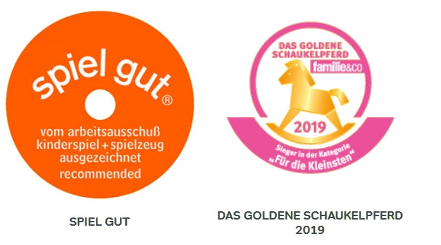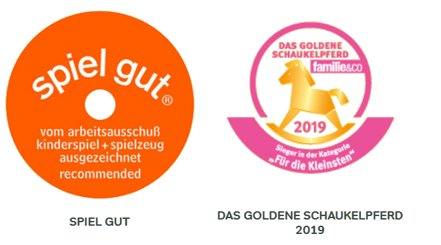 また、このモデルはドイツのおもちゃの認証『Spiel Gut(良く遊ぶ)』を取得しており、また、ドイツで有名な優秀なおもちゃに与えられる賞の『金色の木馬(Das Goldene Schaukelpferd)』を受賞している高品質な商品です。