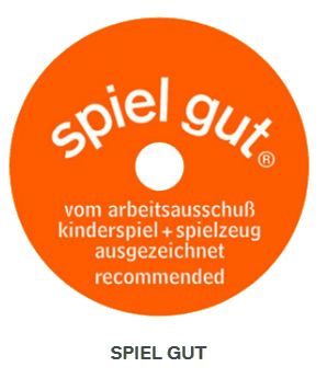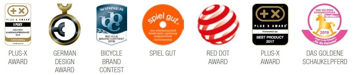 このモデルはドイツのおもちゃの認証『Spiel Gut(良く遊ぶ)』を取得しております。Spiel Gutは各分野の専門家で構成され、おもちゃの対象年齢が子供の実際の年齢や発達段階に合致しているかどうか、十分な耐久性、環境に優しい素材を使用しているかどうか、想像力や楽しさを引き出せる商品かどうか、などを基準にして認証されます。たくさんのおもちゃの中で認定されるのはごくわずかですので、認証されたこのPuky社のバイクもその高い品質を公に認められている事となります。