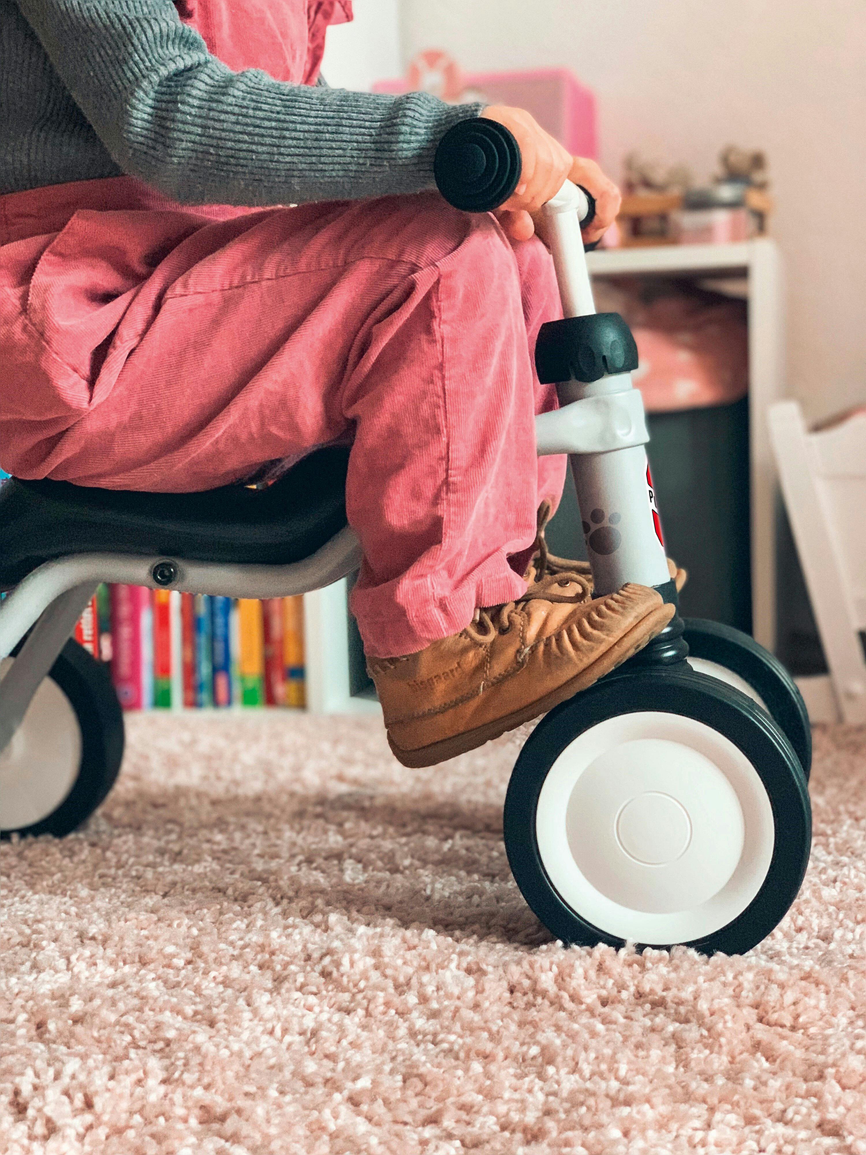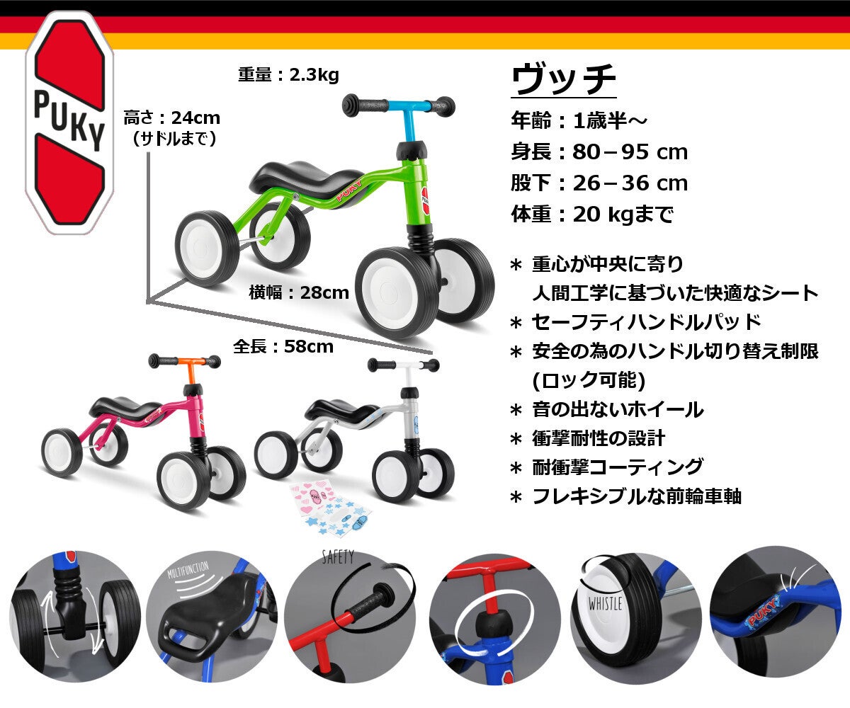 ヴッチはしっかり歩けるようになった1歳半からのお子様向けの乗り物です。前輪の車軸がフレキシブルに稼働するようになっており、ハンドルの切り方を通してお子様のバランス感覚を養う事が出来ますのでプッキーリノの後続機種となります。シートは人間工学に基づき重心が中央に来るように設計され、横転しても安全な様にハンドルパッドがハンドルの両端に付いています。安全の為にハンドルの切り替え制限ロックもありますので、活発になって来た1歳半のお子様の安心して乗せる事が出来ます。