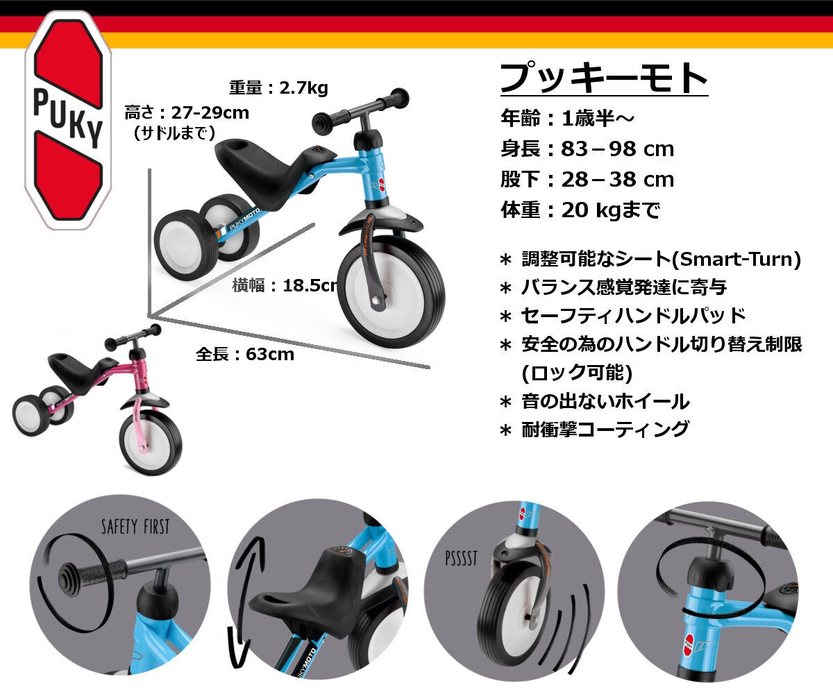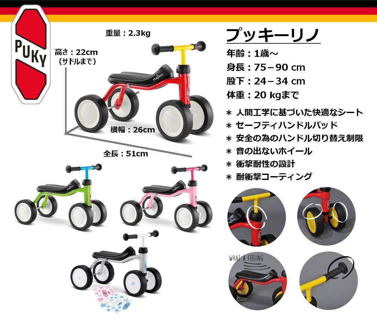 ドイツを中心にヨーロッパで絶大な人気を誇るPuky社の子供用バイクが遂に本格的に日本へ上陸いたします!戦後直後から現在まで70年の歴史の中で培われた最高品質のMade in Germanyのバイク、お子様の運動能力に大きく影響する他、チャレンジ精神を育む事が出来ます。1歳から乗れる室内用4輪車、1歳半からの3輪車、そして2輪バイクとステップアップしながら楽しんで乗る事が出来ます。