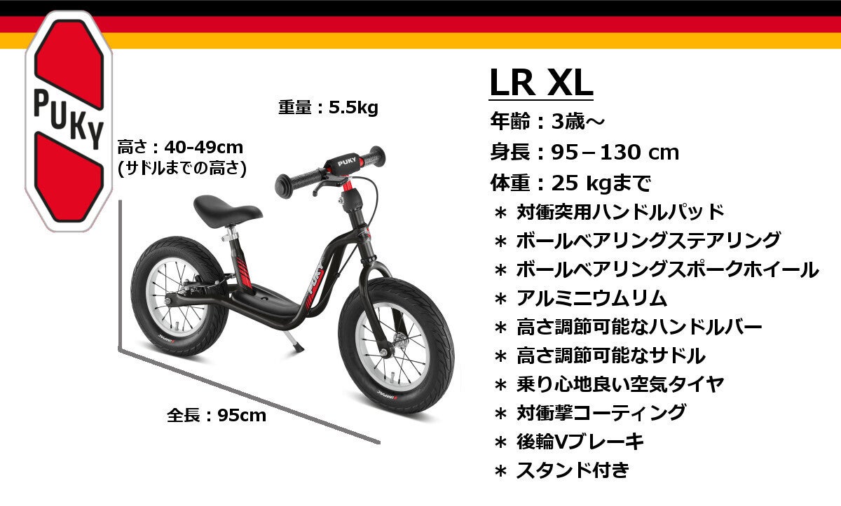 3歳ほどのお子様のサイズに合わせたラーニングバイクがこのLR XLです。12.4インチの空気タイヤに加えてスポークホイールが付いていますので乗り心地は抜群です!オフロードにも対応していますし、後輪にVブレーキが付いていますので運動能力と筋肉の発達したお子様はブレーキを使う事が出来ます。ハンドルの両端のセーフティパッドや対衝撃コーティング、そして制限なく曲がるハンドルのおかげで横転した時にも出来るだけ怪我しないような構造となっています。バナナ型のサドルはスピードが出た時の勢いを体ではなくバイクにかける構造となっており、重心のがぶれないようになっています。また、フットレスト(フットボード)が付いていますのでスピードがある程度出た時には足を置き運転に集中する事が出来ます。