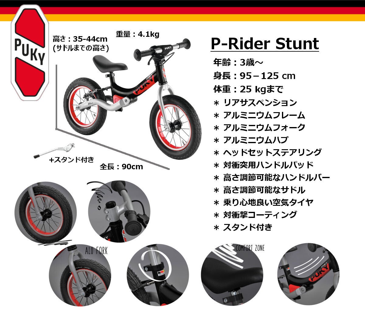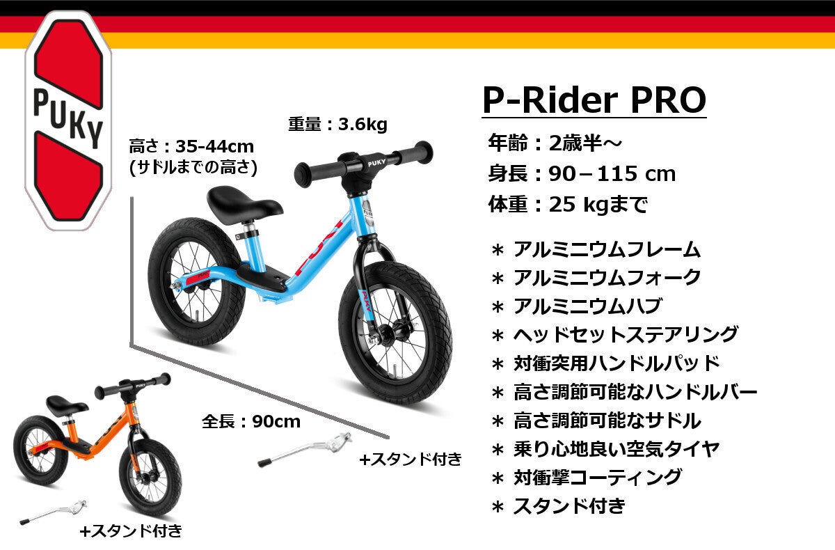 P-Rider StuntはPuky社モデルの中でも最上位クラスのバイクです。レースに特化したアスリートモデルで、軽量なアルミニウム製のフレーム・フォーク・ハブに加えリアのサスペンションが付いており激しいレースやオフロードにも耐えられる作りとなっています。スポークホイールと空気タイヤも乗り心地良く、アヘッドステム、空気タイヤ、スポークホイールもよりスポーティーな扱いに合っています。ハンドルの両端のセーフティパッドや対衝撃コーティング、そして制限なく曲がるハンドルのおかげで横転した時にも出来るだけ怪我しないような構造となっています。バナナ型のサドルはスピードが出た時の勢いを体ではなくバイクにかける構造となっており、重心のがぶれないようになっています。